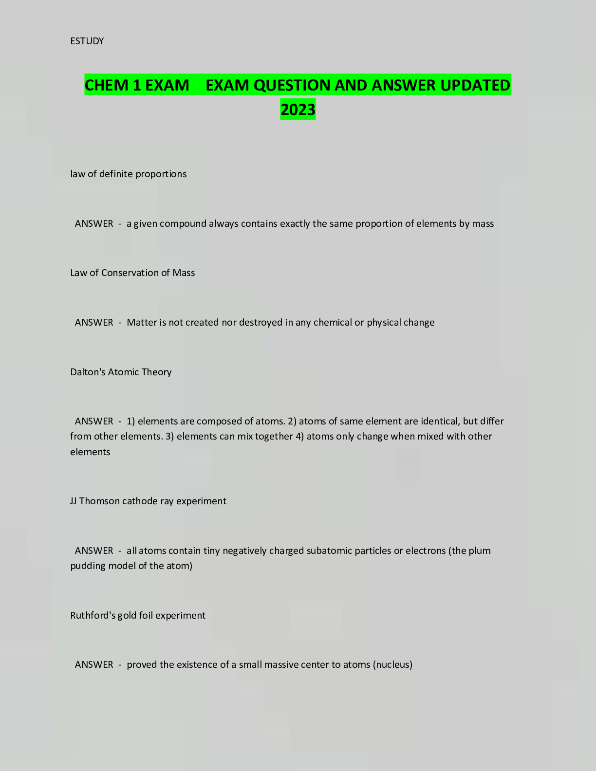 Education > QUESTIONS & ANSWERS > CHEM 1 EXAM EXAM QUESTION AND ANSWER UPDATED 2023 (All)