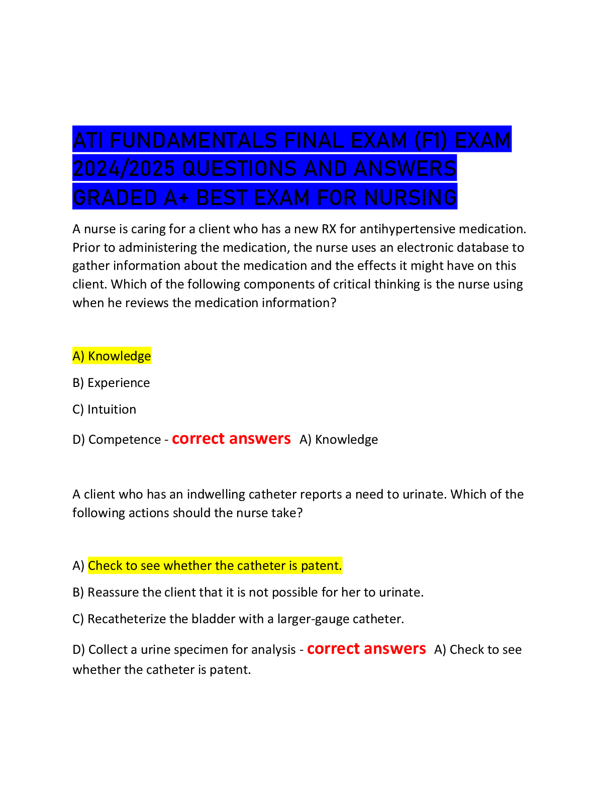 Education > EXAMs > ATI FUNDAMENTALS FINAL EXAM (F1) EXAM 2024/2025 QUESTIONS AND ANSWERS GRADED A+ BEST EXAM FOR NURSING (All)