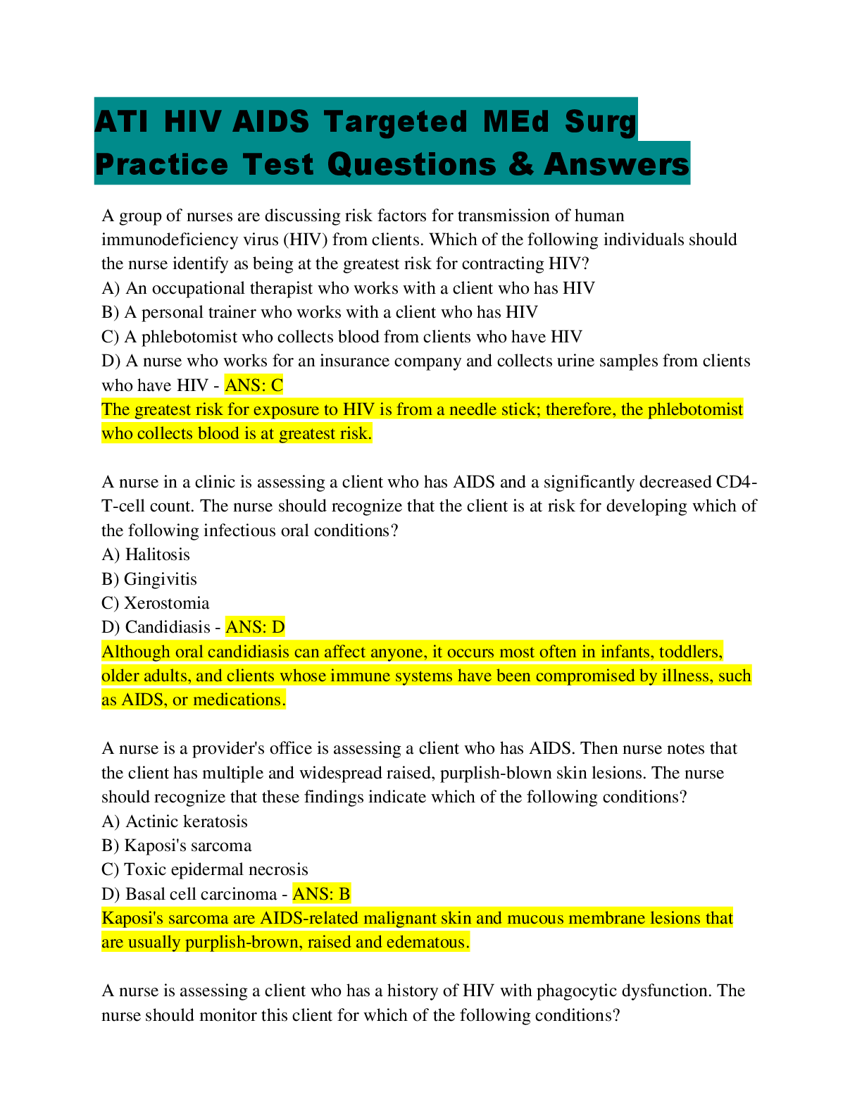 Education > EXAMs > ATI HIV AIDS Targeted MEd Surg Practice Test Questions & Answers (All)