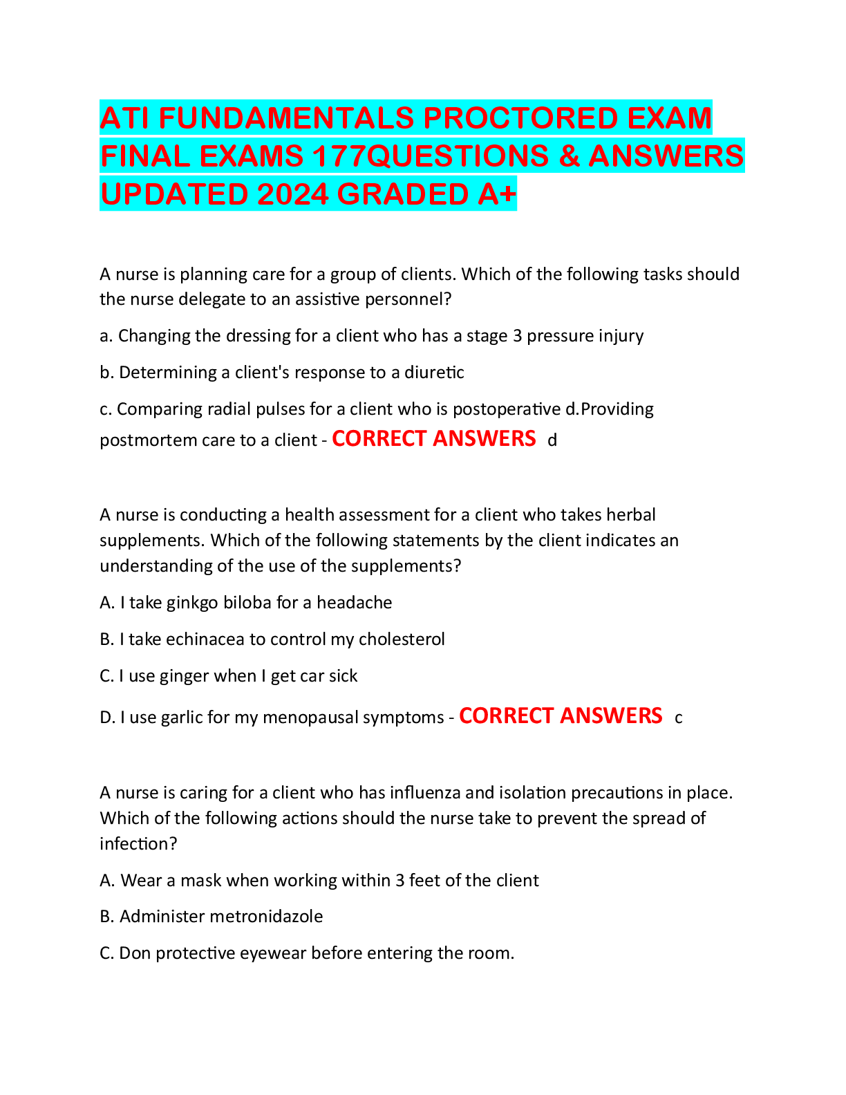 Education > EXAMs > ATI FUNDAMENTALS PROCTORED EXAM FINAL EXAMS 177QUESTIONS & ANSWERS UPDATED 2024 GRADED A+ (All)