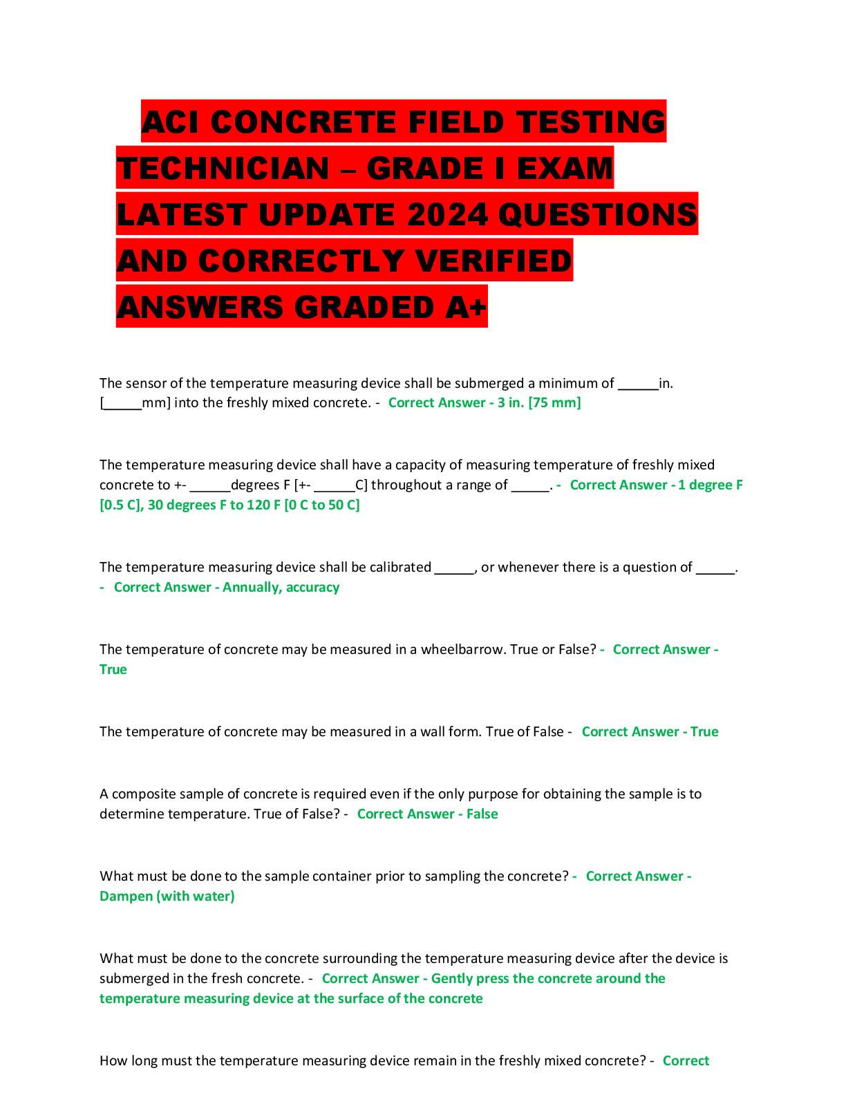 Education > EXAMs > ACI CONCRETE FIELD TESTING TECHNICIAN QUESTIONS WITH CORRECT ANSWERS 2024 (All)