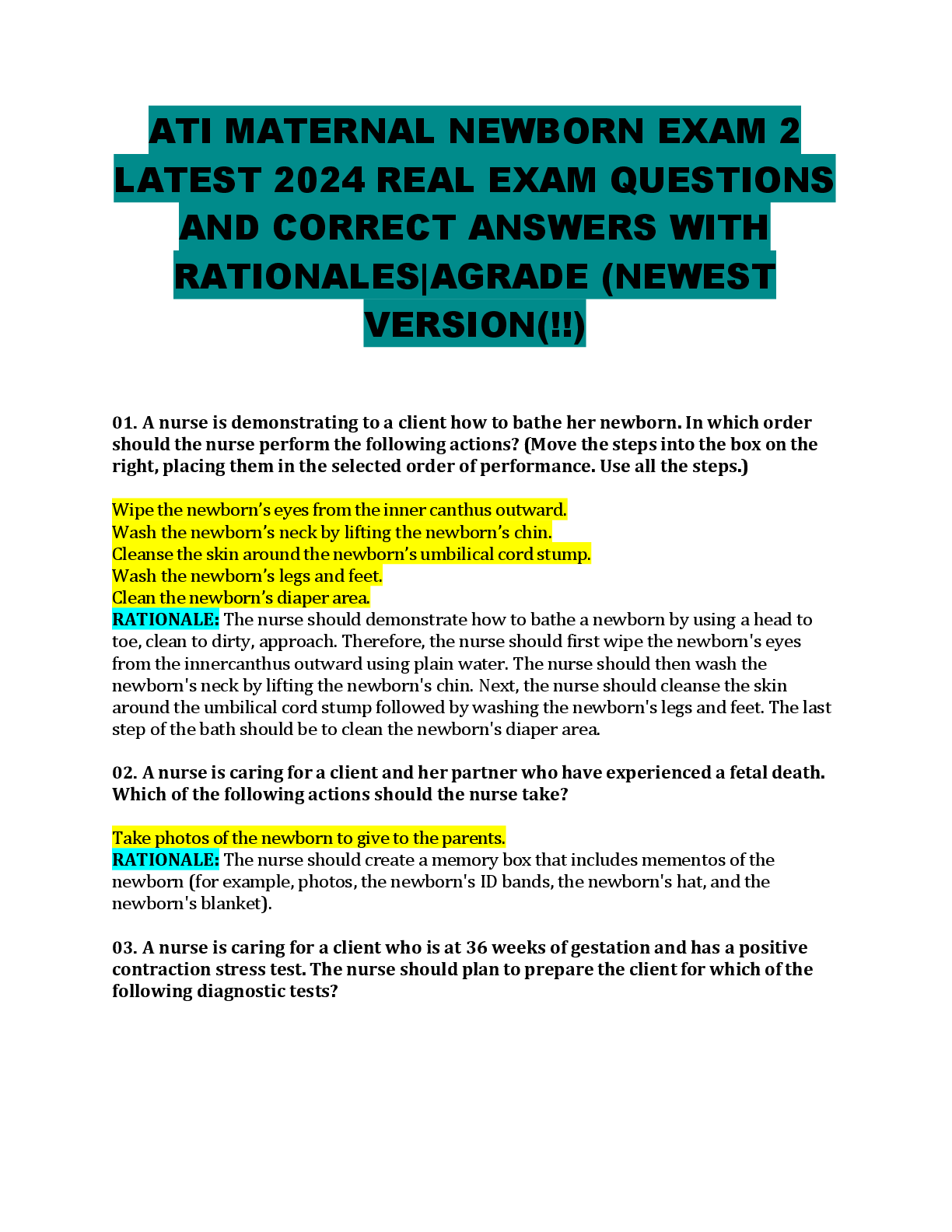 Education > EXAMs > ATI MATERNAL NEWBORN EXAM 2 LATEST 2024 REAL EXAM QUESTIONS AND CORRECT ANSWERS WITH RATIONALES|AGRADE (NEWEST VERSION (All)