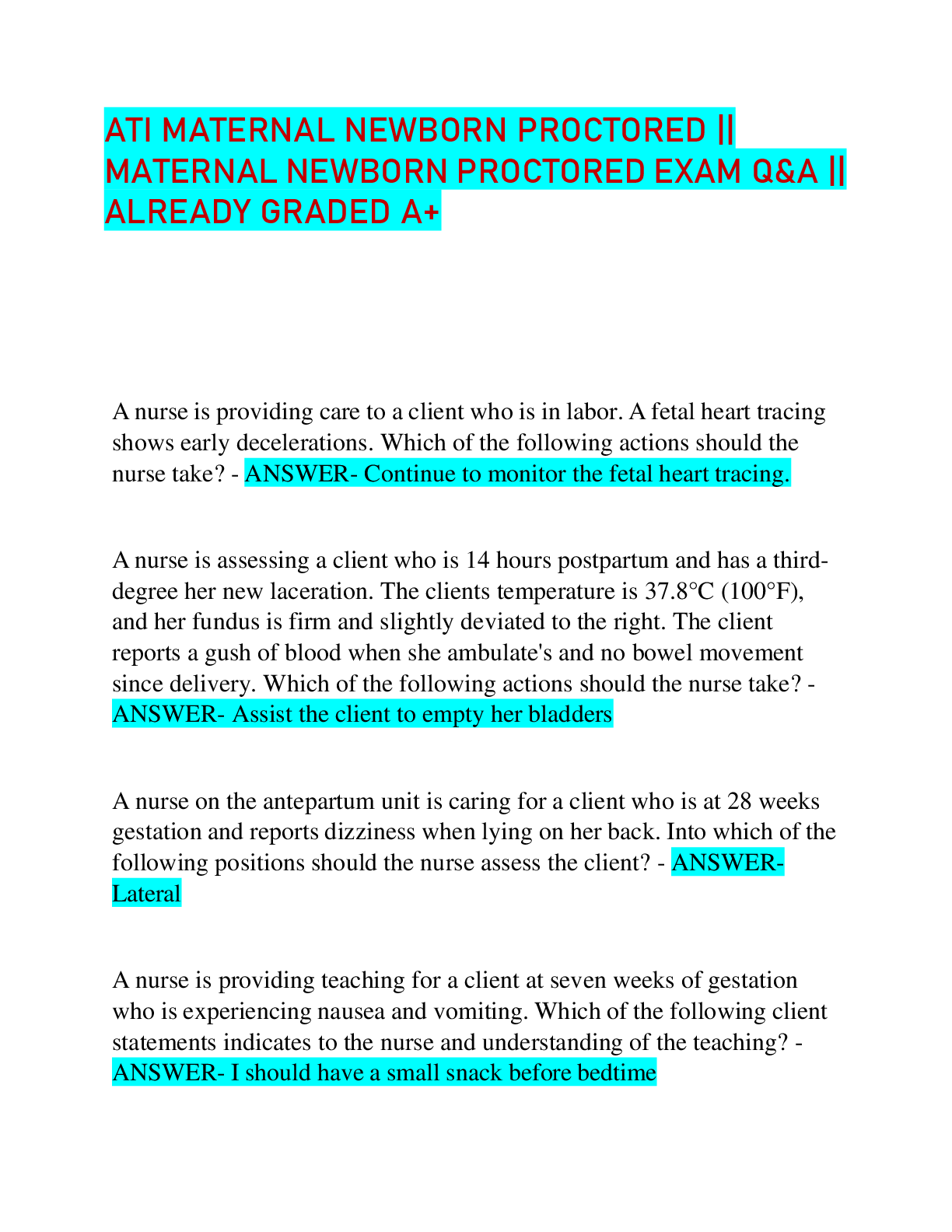 Education > EXAMs > Ati Maternal Newborn Proctored Exam 2024-2025 Maternal Newborn Ati Proctored Exam Latest Update Questions And Correct Answers Rated A+ (All)