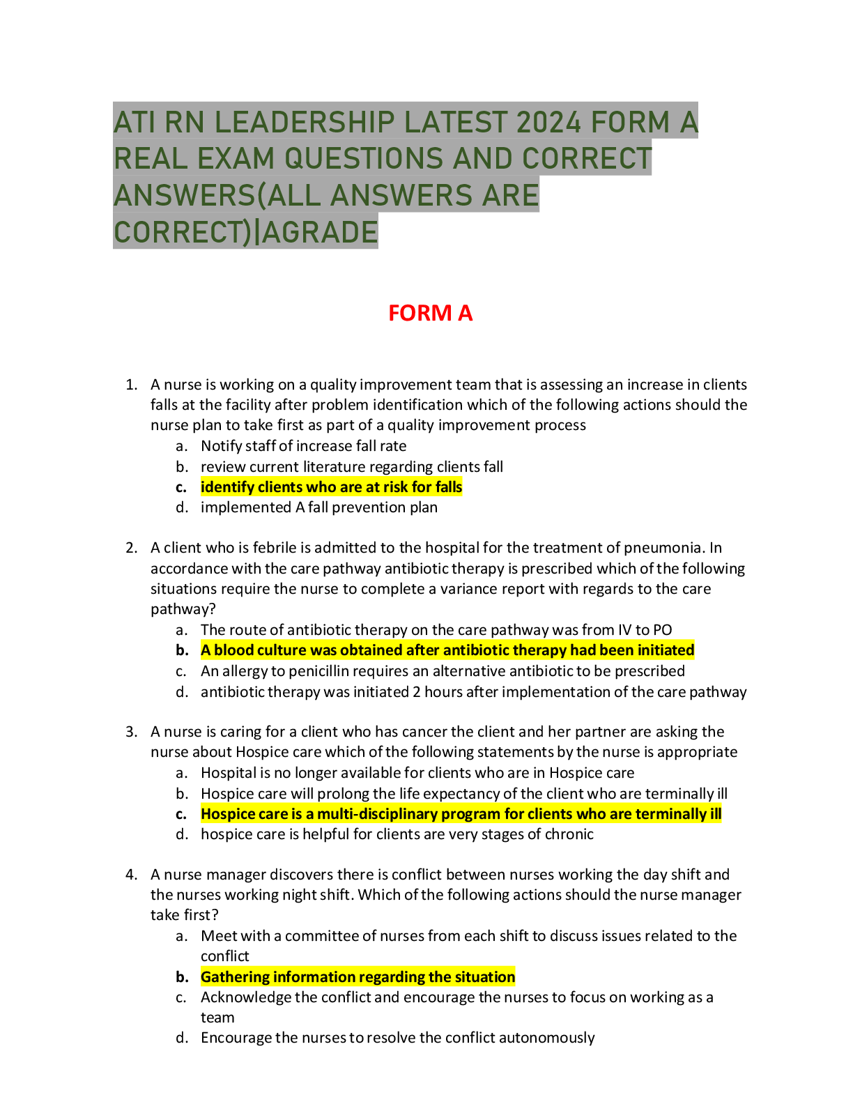 Education > EXAMs > ATI RN LEADERSHIP LATEST 2024 FORM A REAL EXAM QUESTIONS AND CORRECT ANSWERS(ALL ANSWERS ARE CORRECT)|AGRADE (All)