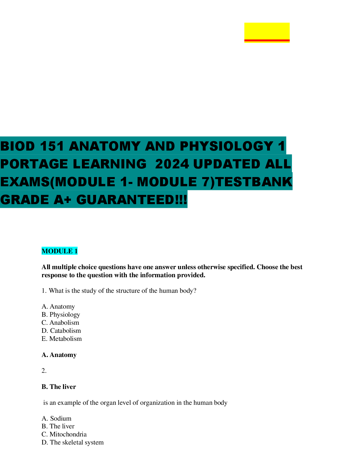 Education > EXAMs > BIOD 151 ANATOMY AND PHYSIOLOGY 1 PORTAGE LEARNING 2024 UPDATED ALL EXAMS(MODULE 1- MODULE 7)TESTBANK GRADE A+ GUARANTEED (All)