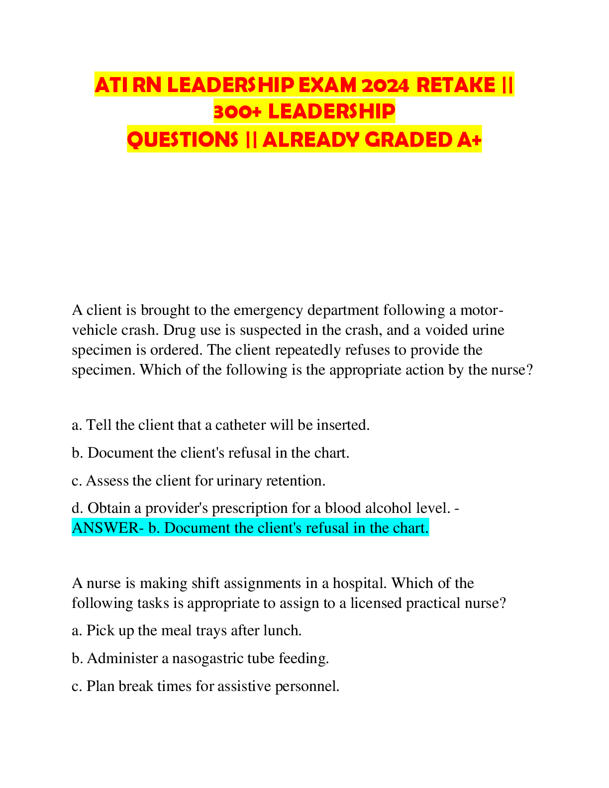 Education > EXAMs > ATI RN LEADERSHIP EXAM 2024 RETAKE || 300+ LEADERSHIP QUESTIONS || ALREADY GRADED A+ (All)