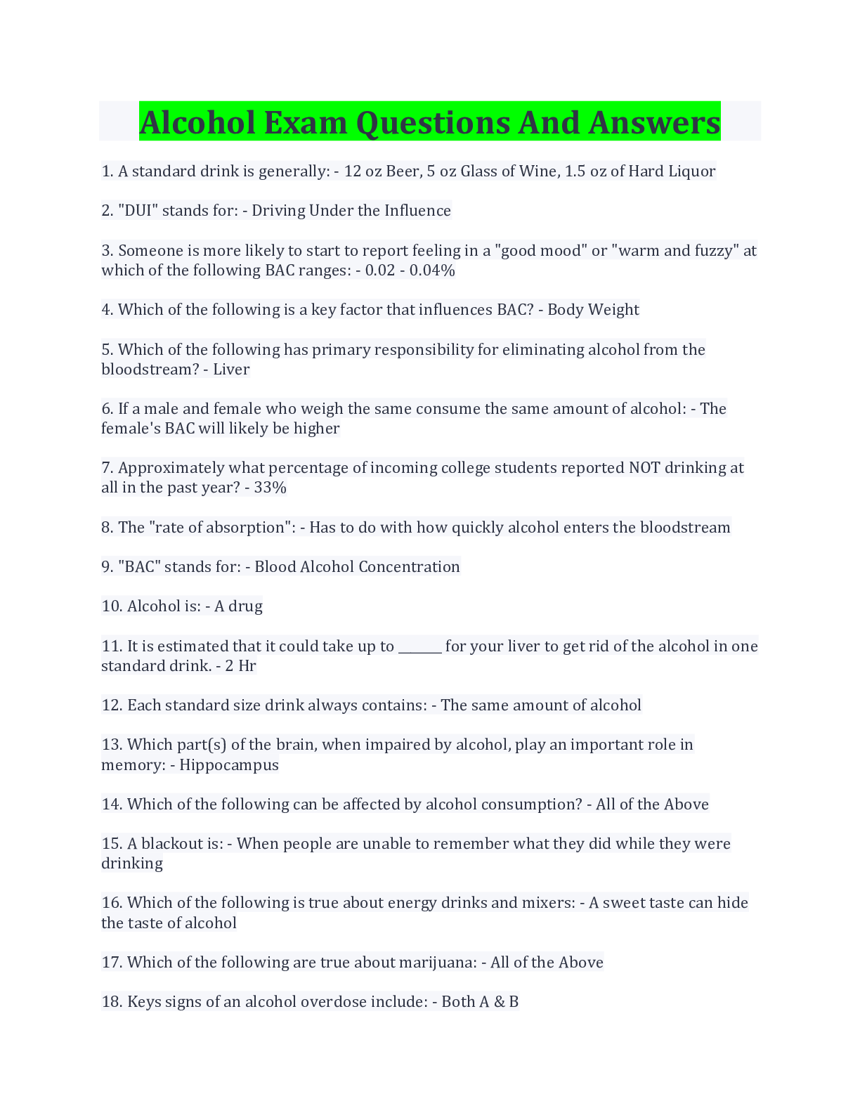 Education > EXAM > Alcohol Exam Questions And Answers/ Download (All)