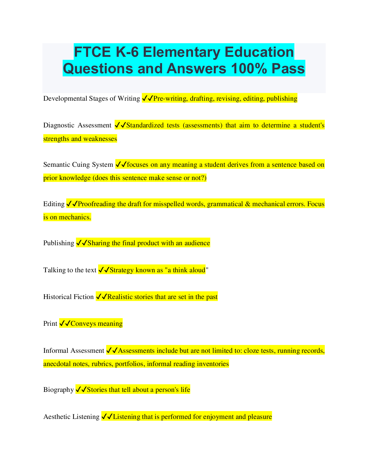Education > QUESTIONS & ANSWERS > FTCE K-6 Elementary Education Questions and Answers 100% Pass (All)