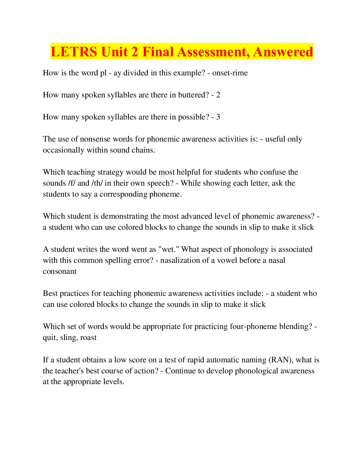 Education > EXAM > LETRS Unit 2 Final Assessment, Answered (All)