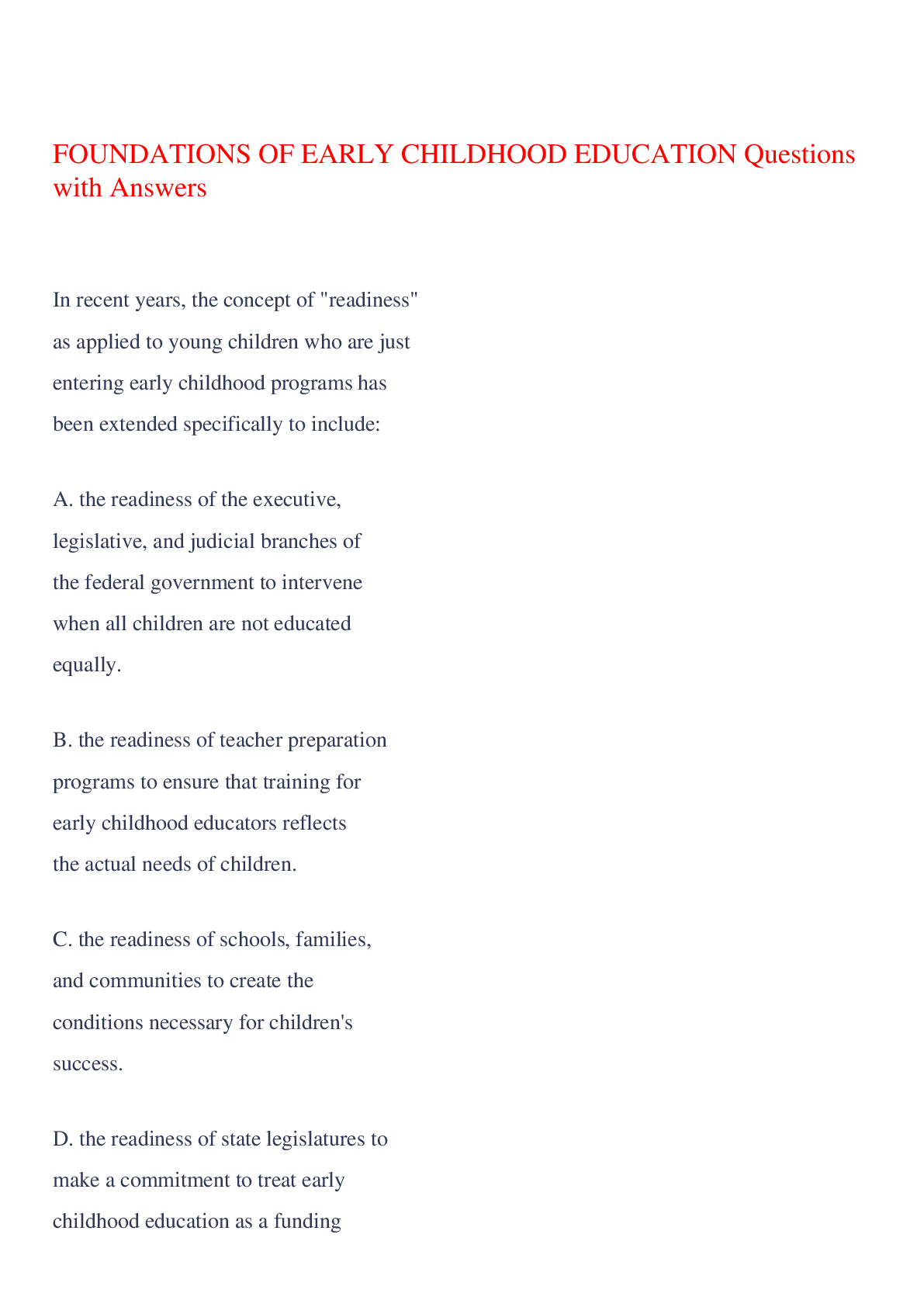 Education > EXAM > FOUNDATIONS OF EARLY CHILDHOOD EDUCATION Questions with Answers,100% CORRECT (All)