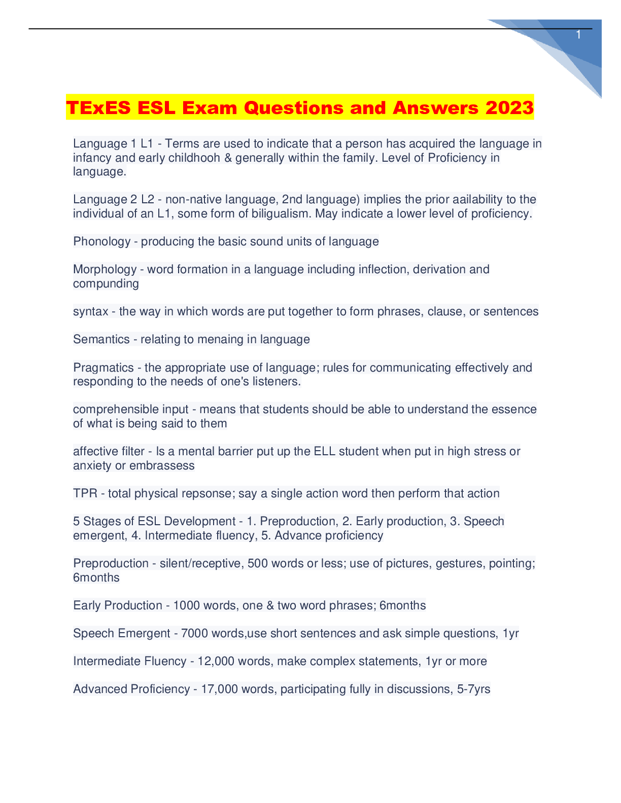 Education > EXAM > TExES ESL Exam Questions and Answers 2023 (All)