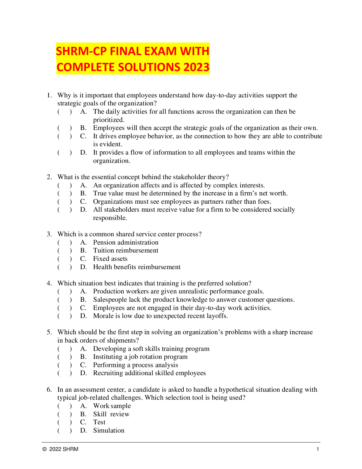 Education > EXAM > SHRM CP-SCP Supplemental SJs Questions and Answers Latest 2023 (All)