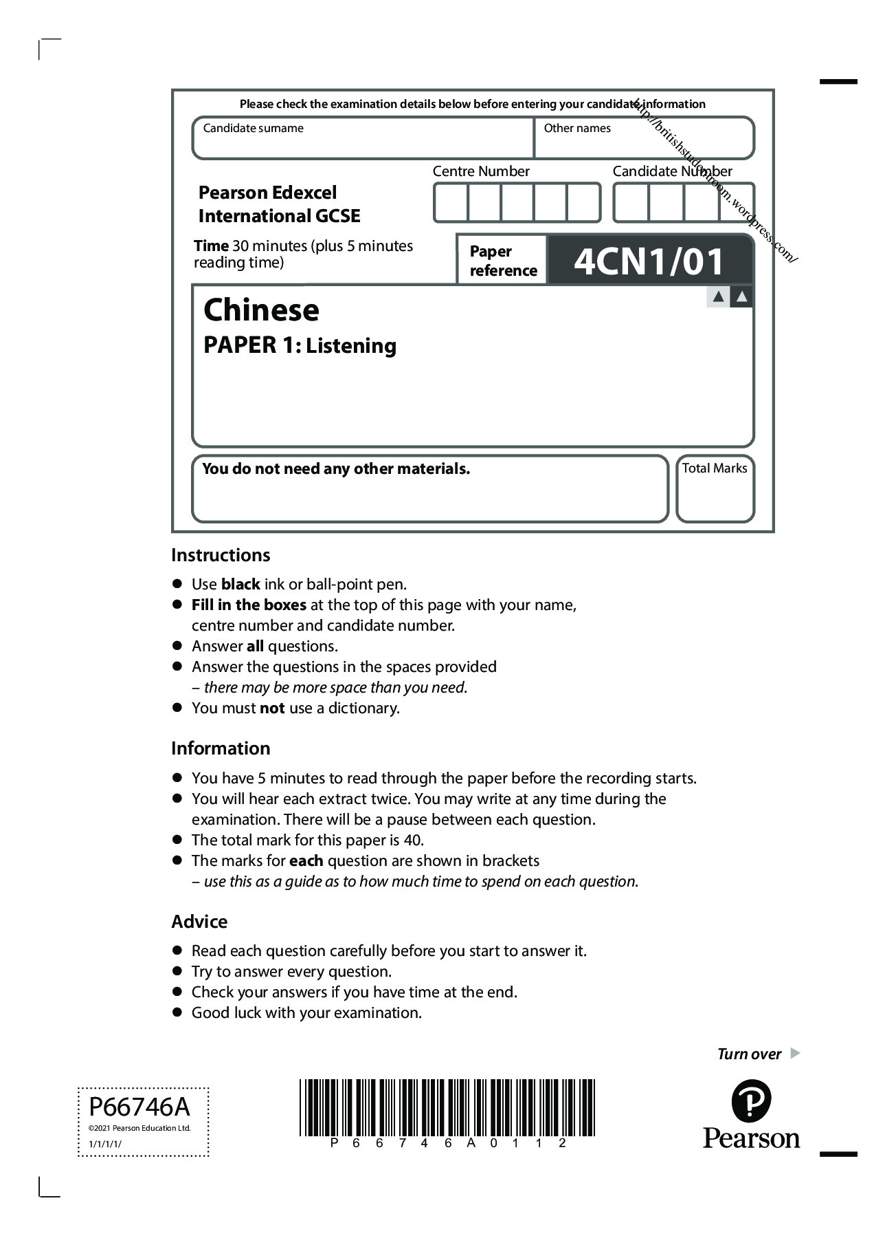 Chinese > EXAMs > Pearson Edexcel International GCSE Chinese PAPER 1: Listening QP 2021 (All)