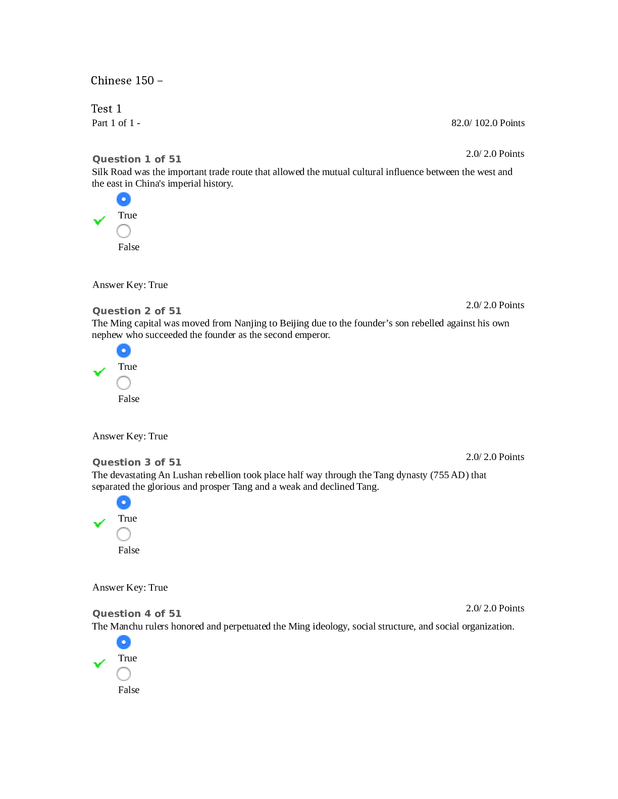 Chinese > QUESTIONS & ANSWERS > Chinese 150 – | Download for quality grades | 100% correct answers | (All)