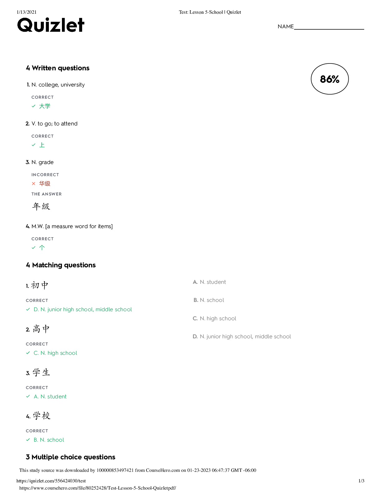 Chinese > Quiz > Test_ Lesson 5-School _ Quizlet.pdf | Download for quality grades| (All)