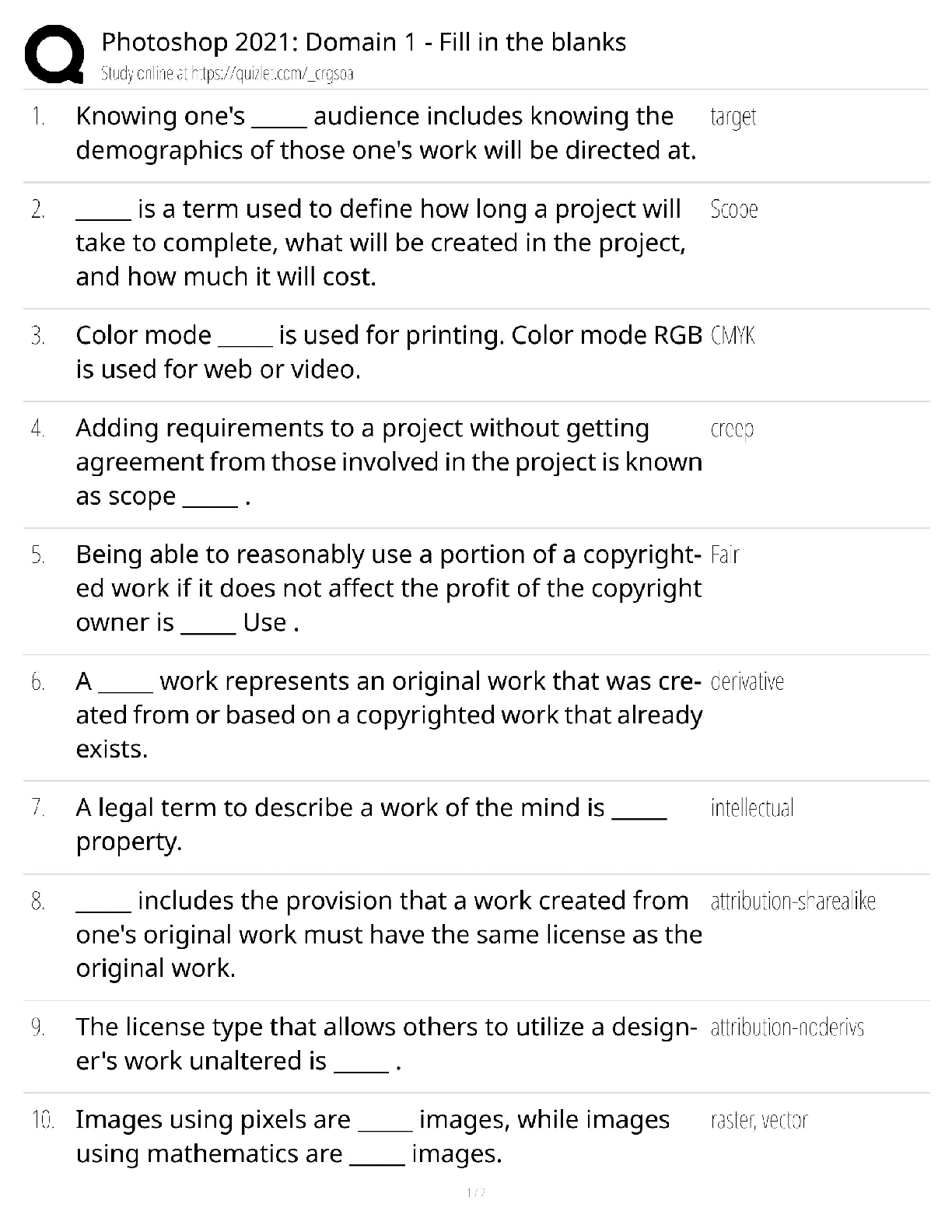 Media Studies > QUESTIONS & ANSWERS > Photoshop 2021 Domain 1 / Fill-in-the-Blanks Practice Test / 2025 Update / Score 100% (All)