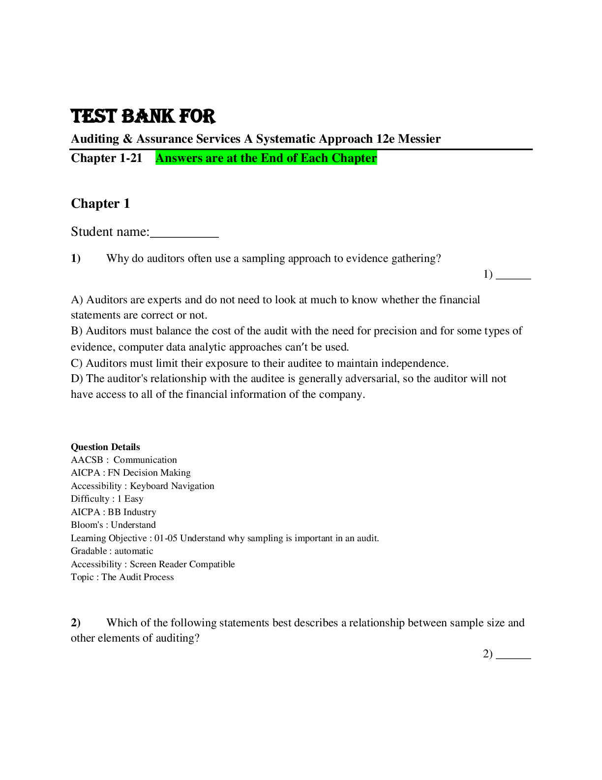 Auditing > TEST BANKS > Test Bank for Auditing & Assurance Services A Systematic Approach 12e Messier Chapter 1-21 (All)