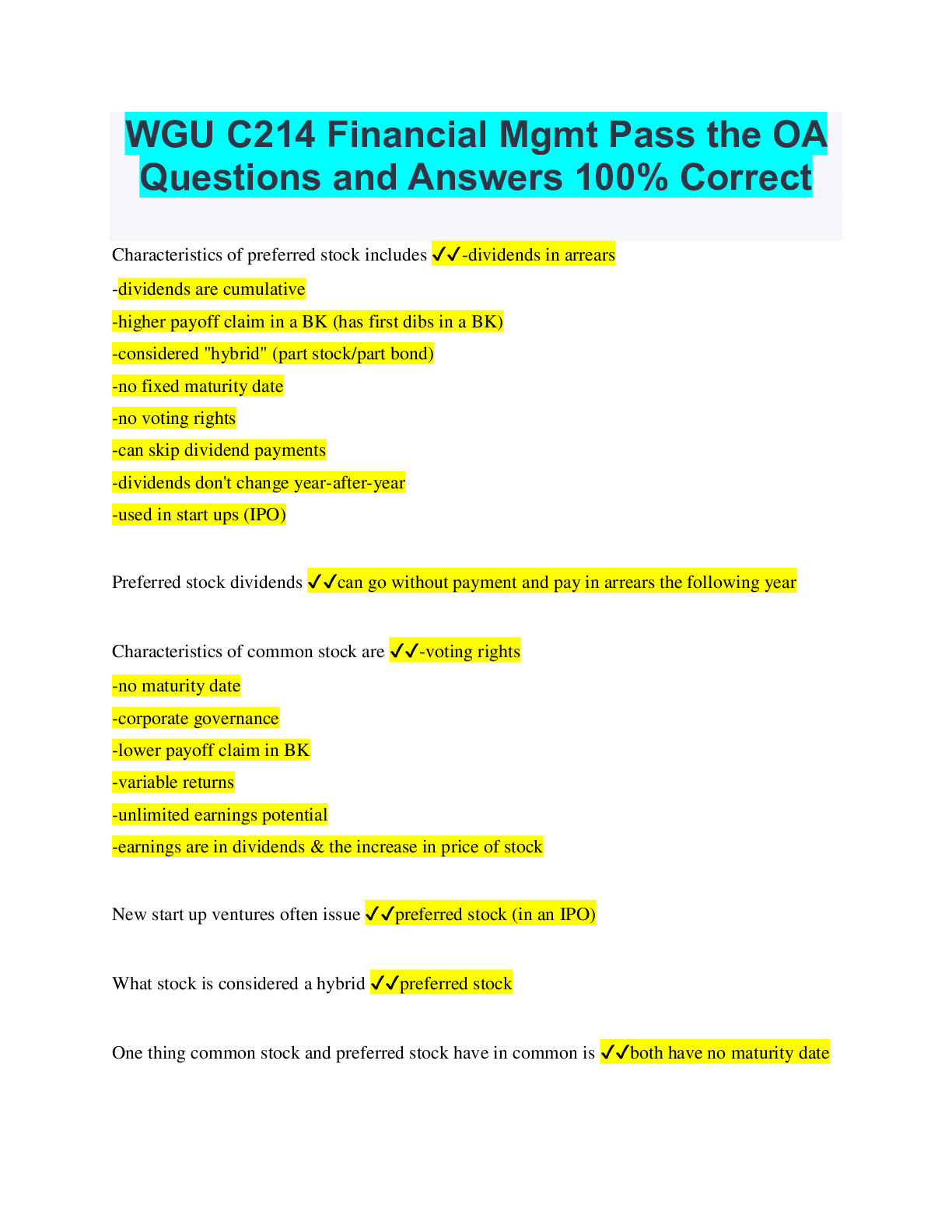 Financial Auditing > EXAM > WGU C214 Financial Mgmt Pass the OA Questions and Answers 100% Correct (All)