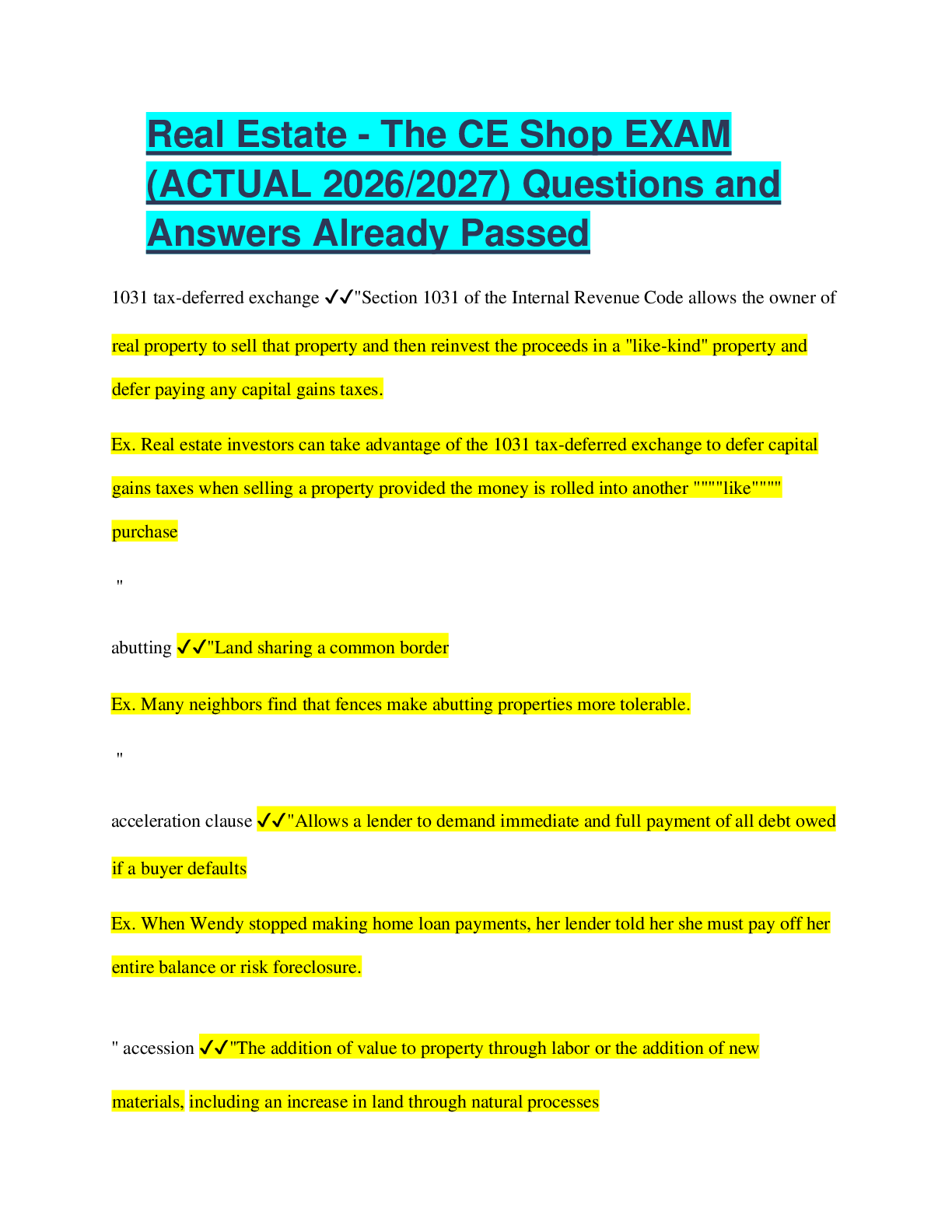 Financial Auditing > QUESTIONS & ANSWERS > Real Estate - The CE Shop EXAM (ACTUAL 2026/2027) Questions and Answers Already Passed (All)
