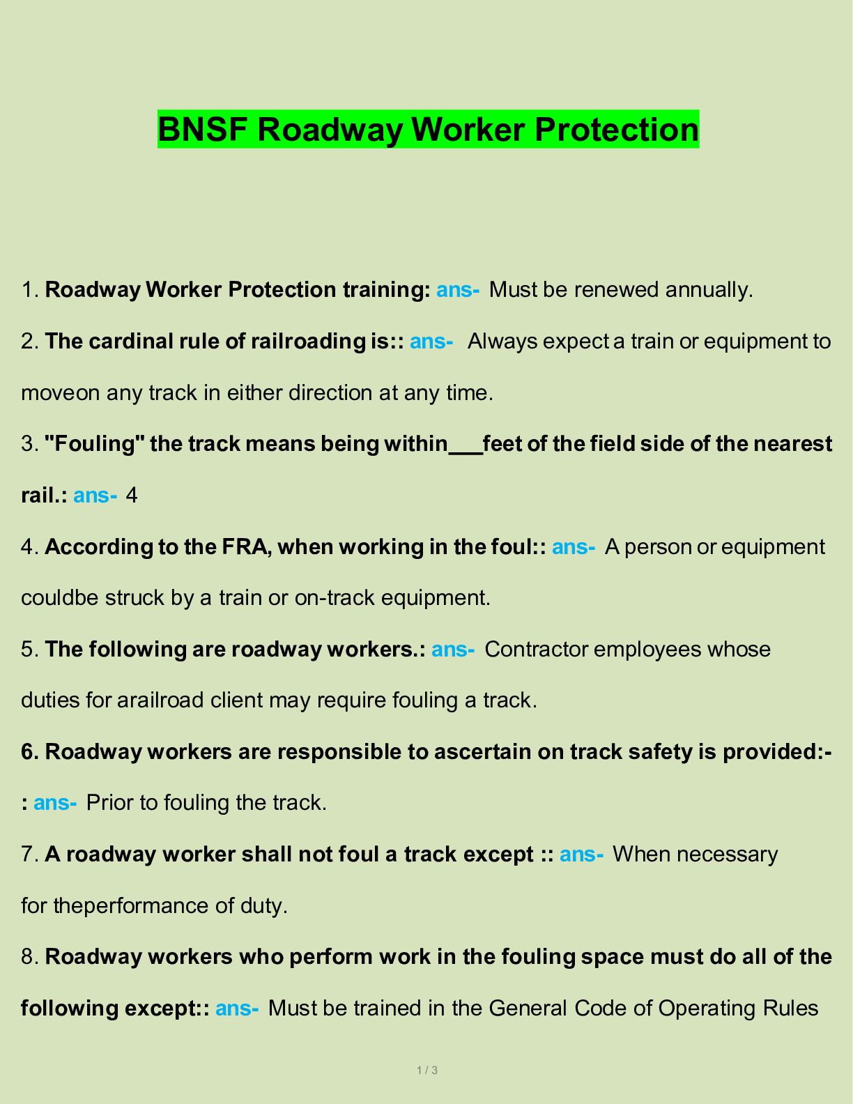 Engineering > EXAM > BNSF Roadway Worker Protection Exam Questions with Answers 2024! 100% CORRECT ANSWERS (All)