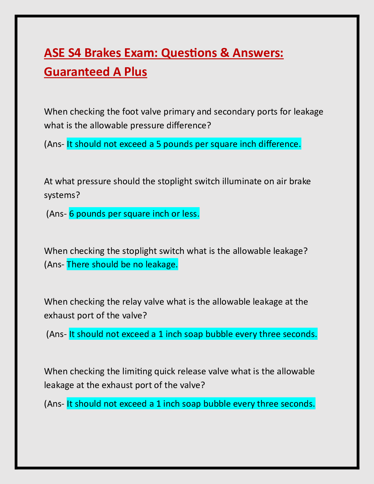 Engineering > EXAM > ASE S4 Brakes Exam: Questions & Answers: Guaranteed A Plus (All)