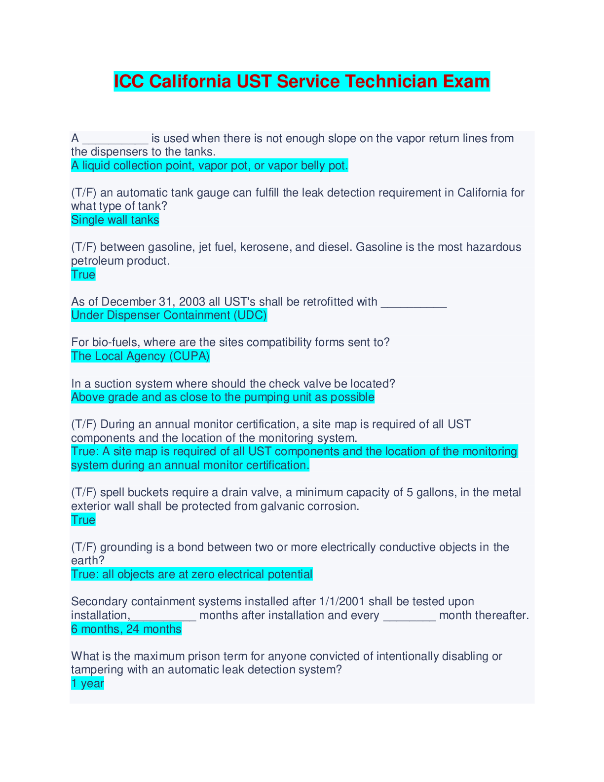 Engineering > EXAM > ICC California UST Service Technician Exam - Questions and Answers (All)