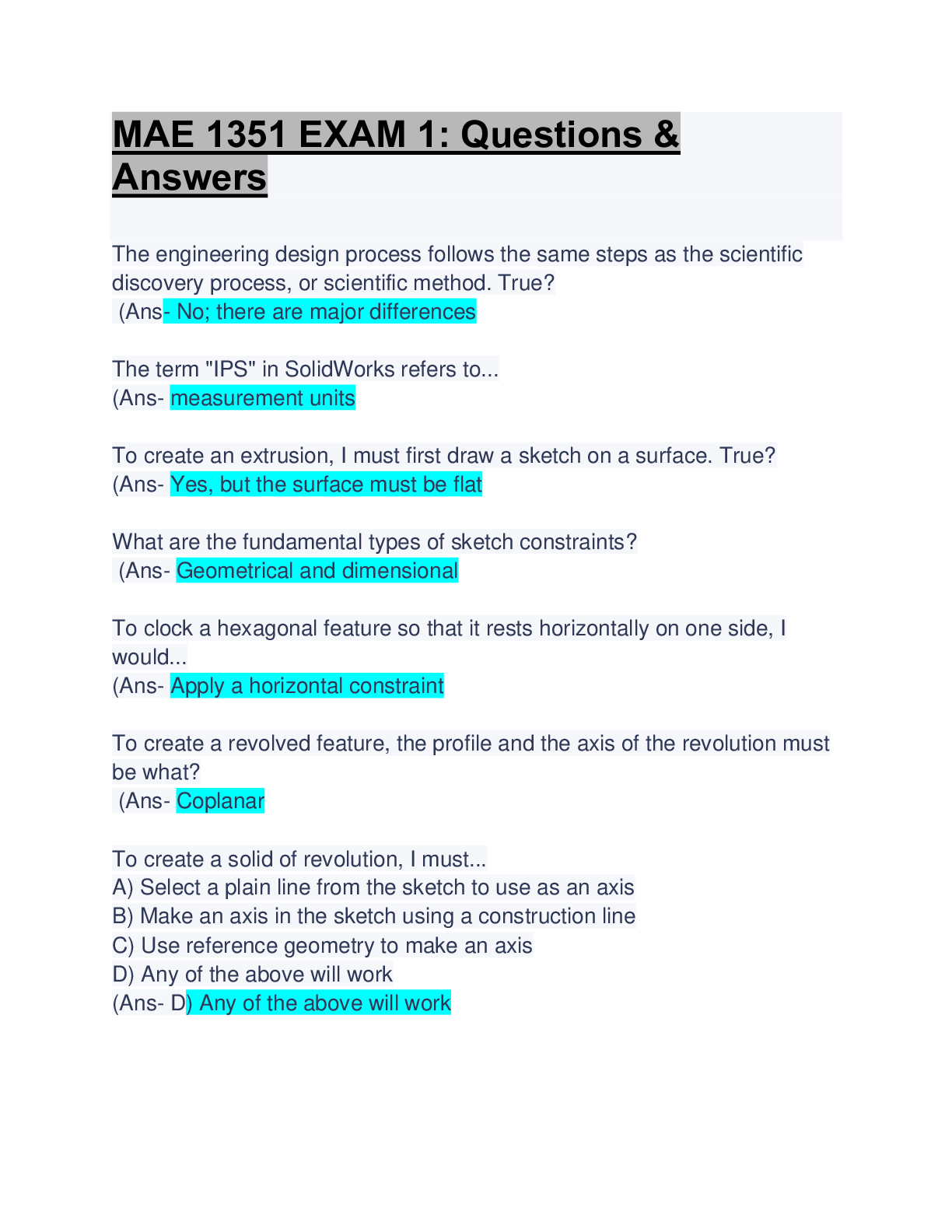 Engineering > EXAM > MAE 1351 EXAM 1: Questions & Answers: Updated A+ Solution Guide (All)