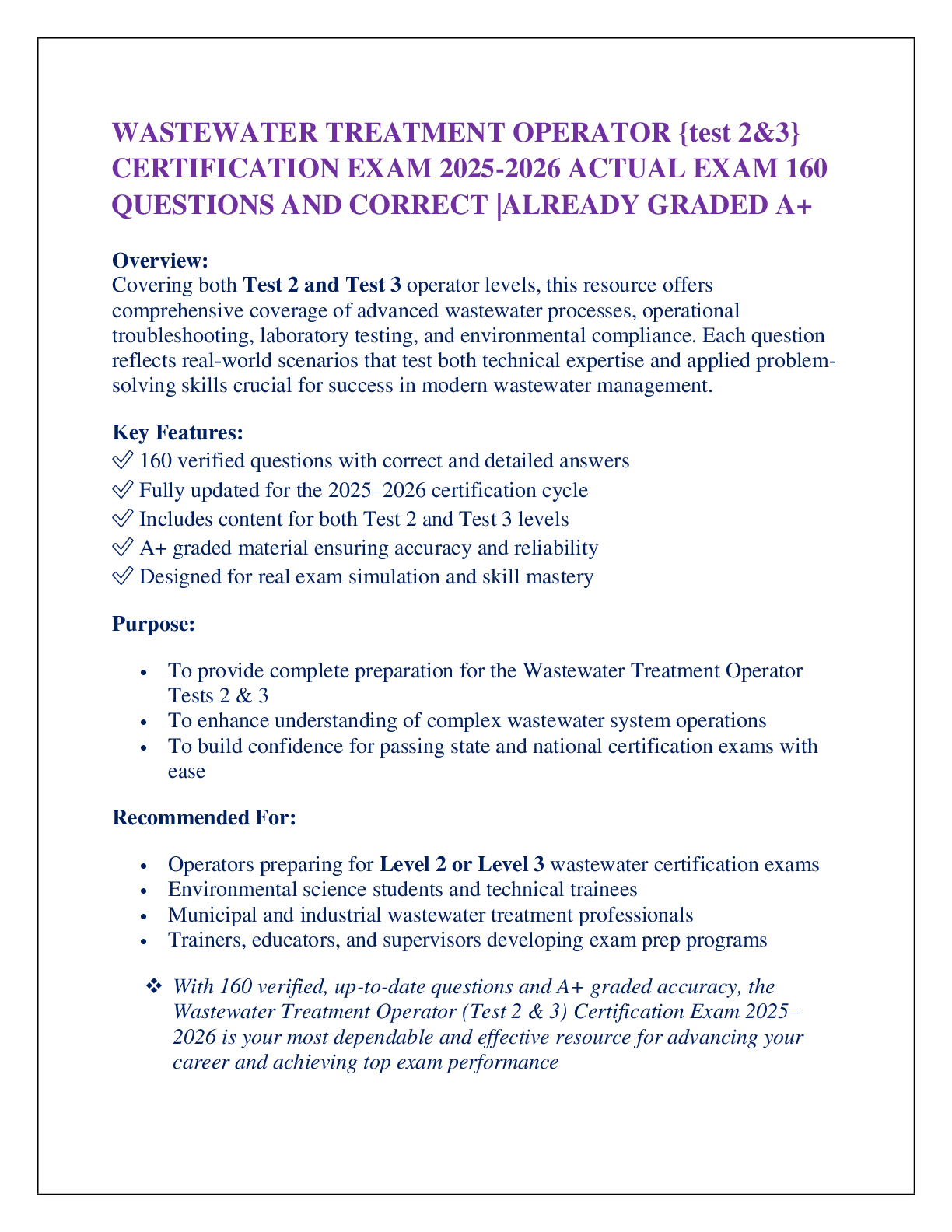 Engineering > EXAM > WASTEWATER TREATMENT OPERATOR {test 2&3} CERTIFICATION EXAM 2025-2026 ACTUAL EXAM 160 QUESTIONS AND CORRECT |ALREADY GRADED A+ (All)