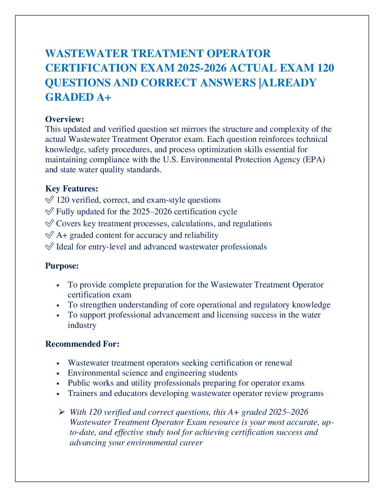 Engineering > EXAM > WASTEWATER TREATMENT OPERATOR CERTIFICATION EXAM 2025-2026 ACTUAL EXAM 120 QUESTIONS AND CORRECT ANSWERS |ALREADY GRADED A+ (All)