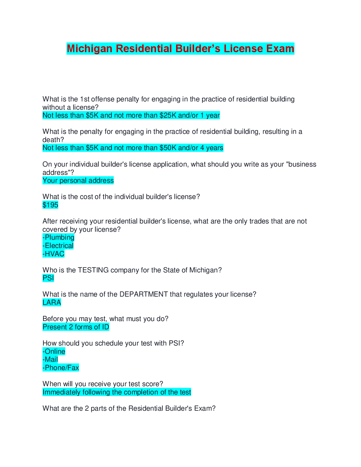 Engineering > EXAM > Michigan Residential Builder’s License Exam | Updated 2025/2026, Complete Solutions (All)