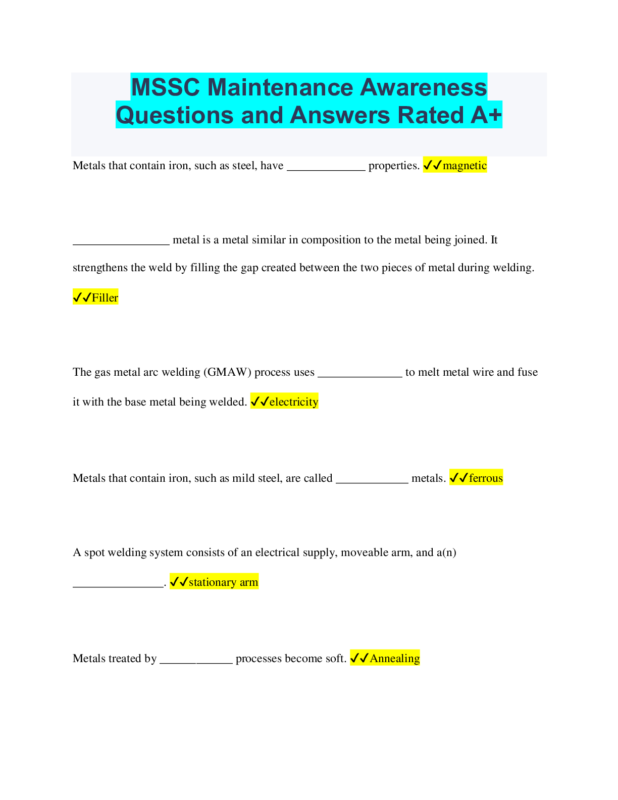 Engineering > QUESTIONS & ANSWERS > MSSC Maintenance Awareness Questions and Answers Rated A+ (All)