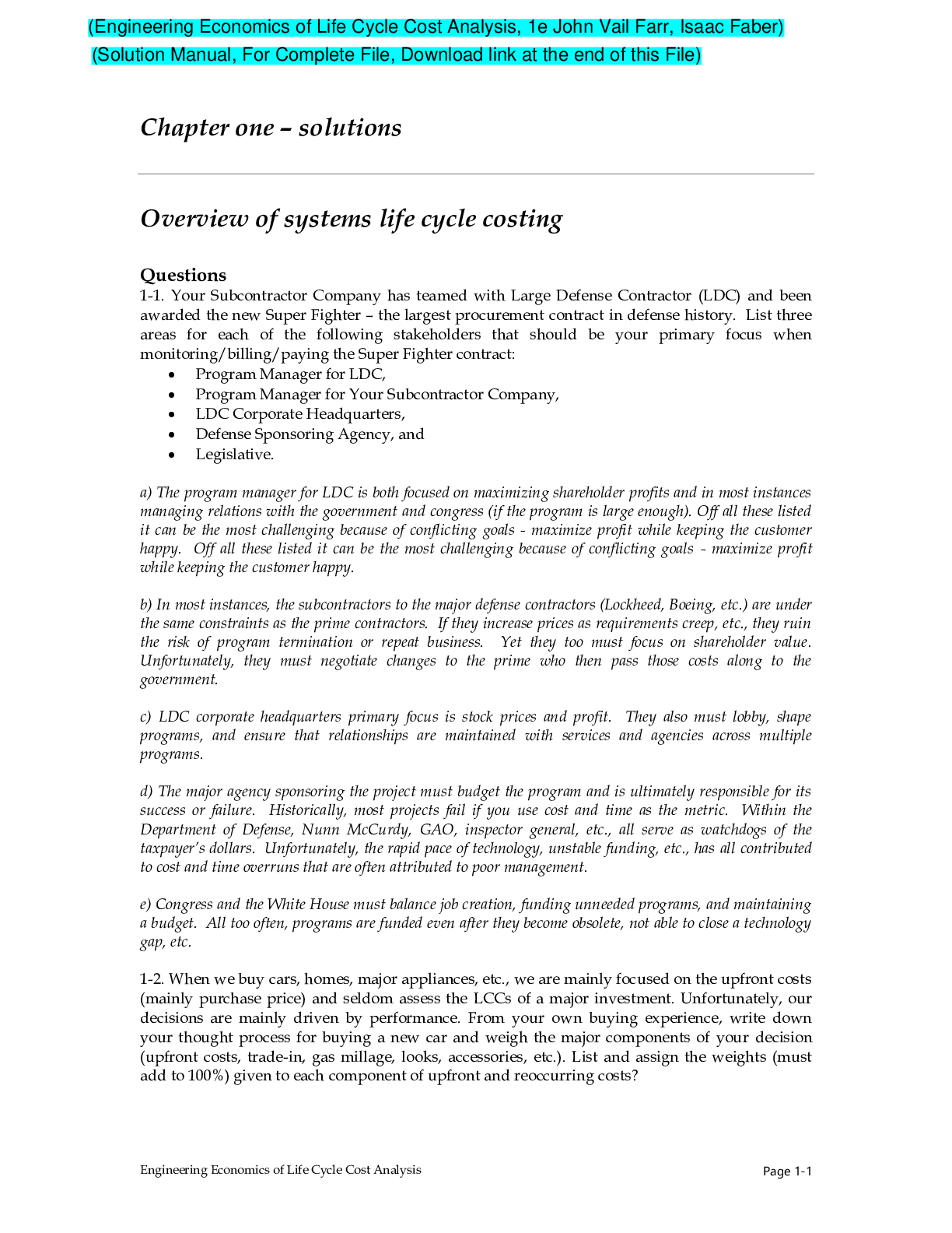 Engineering > SOLUTIONS MANUAL > Engineering Economics of Life Cycle Cost Analysis, 1e John Vail Farr, Isaac Faber (Solution Manual) (All)