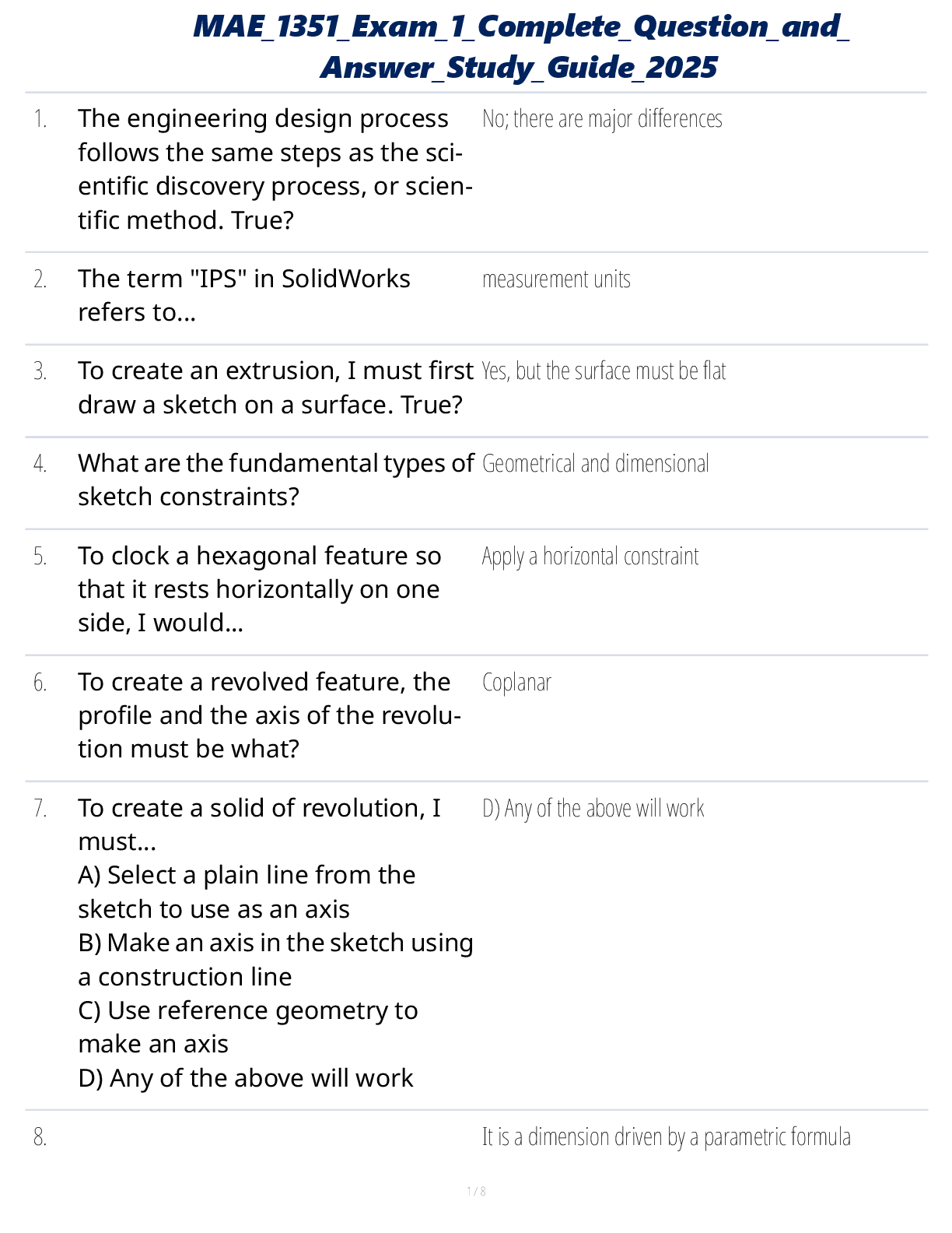 Engineering > STUDY GUIDE > MAE 1351 Exam 1 Complete Question and Answer Study Guide 2025 (All)