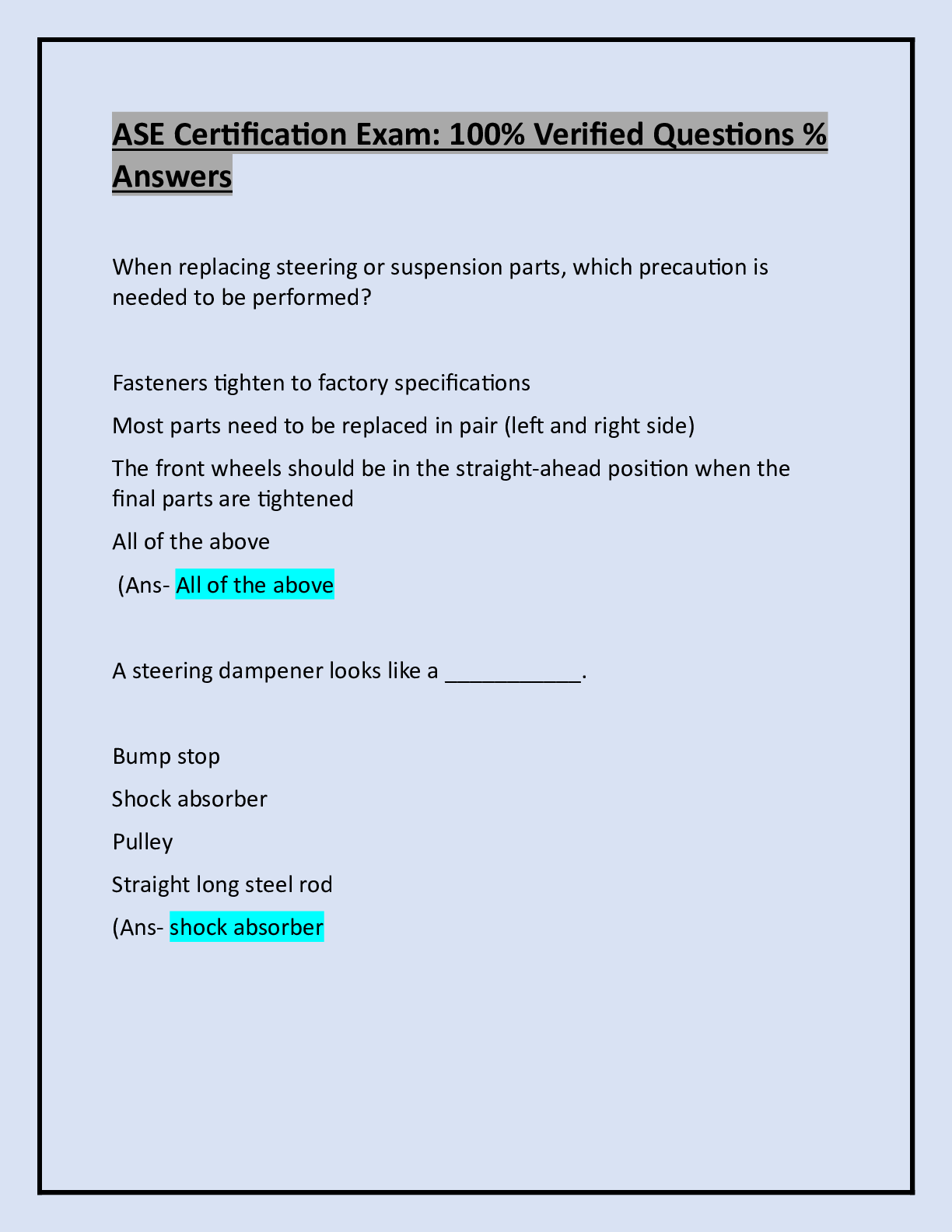 Engineering > EXAM > ASE Certification Exam: 100% Verified Questions & Answers (All)