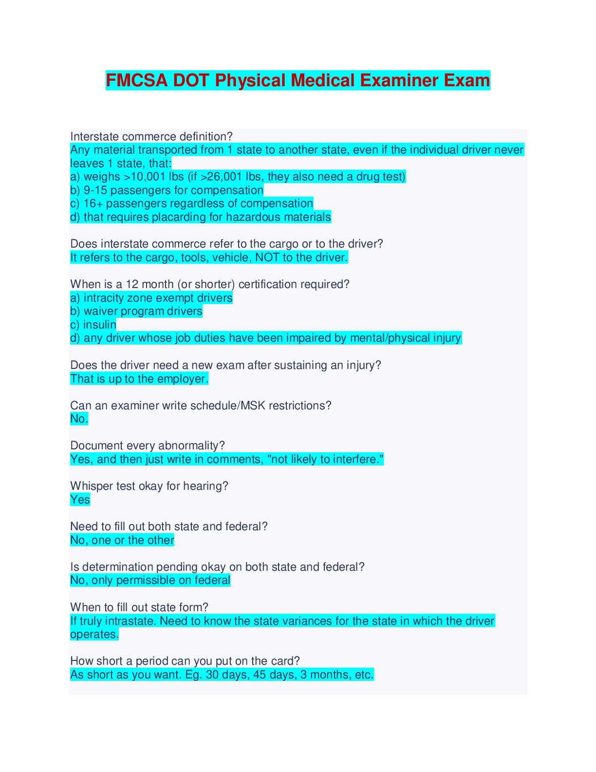 Medicine > EXAM > FMCSA DOT Physical Medical Examiner Exam (All)