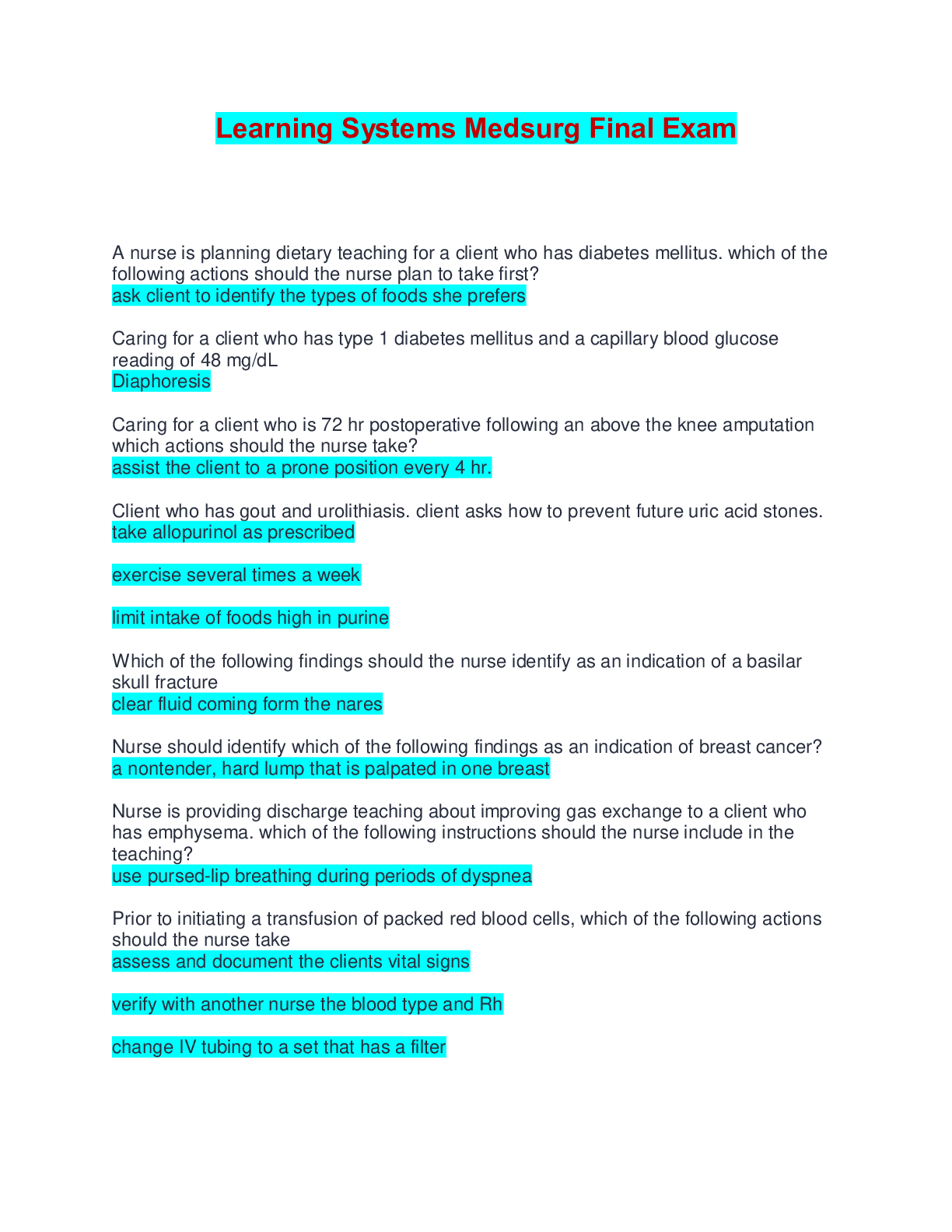Medicine > EXAM > Learning Systems Medsurg Final Exam | Questions and Answers (All)
