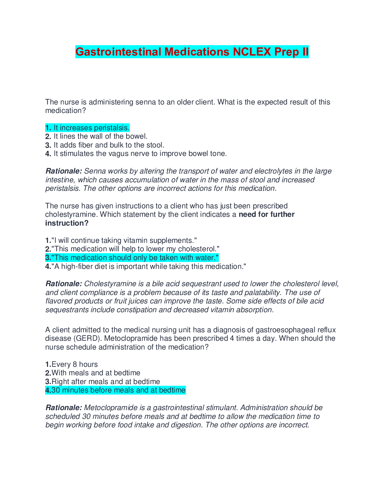 Medicine > EXAM > Gastrointestinal Medications NCLEX Prep II | Q & A (Complete Solutions) (All)