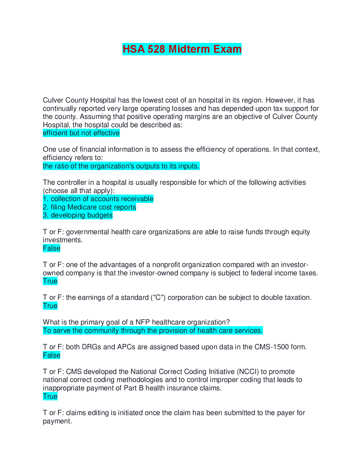 Medicine > EXAMs > HSA 528 Midterm Exam | Questions with 100% Correct Answers (All)