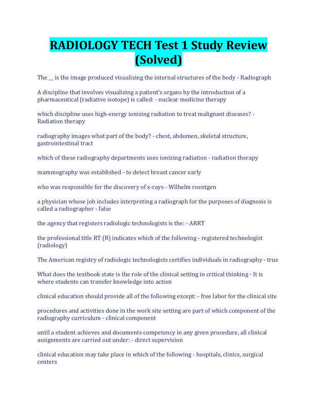 Medicine > EXAMs > RADIOLOGY TECH Test 1 Study Review (Solved) (All)
