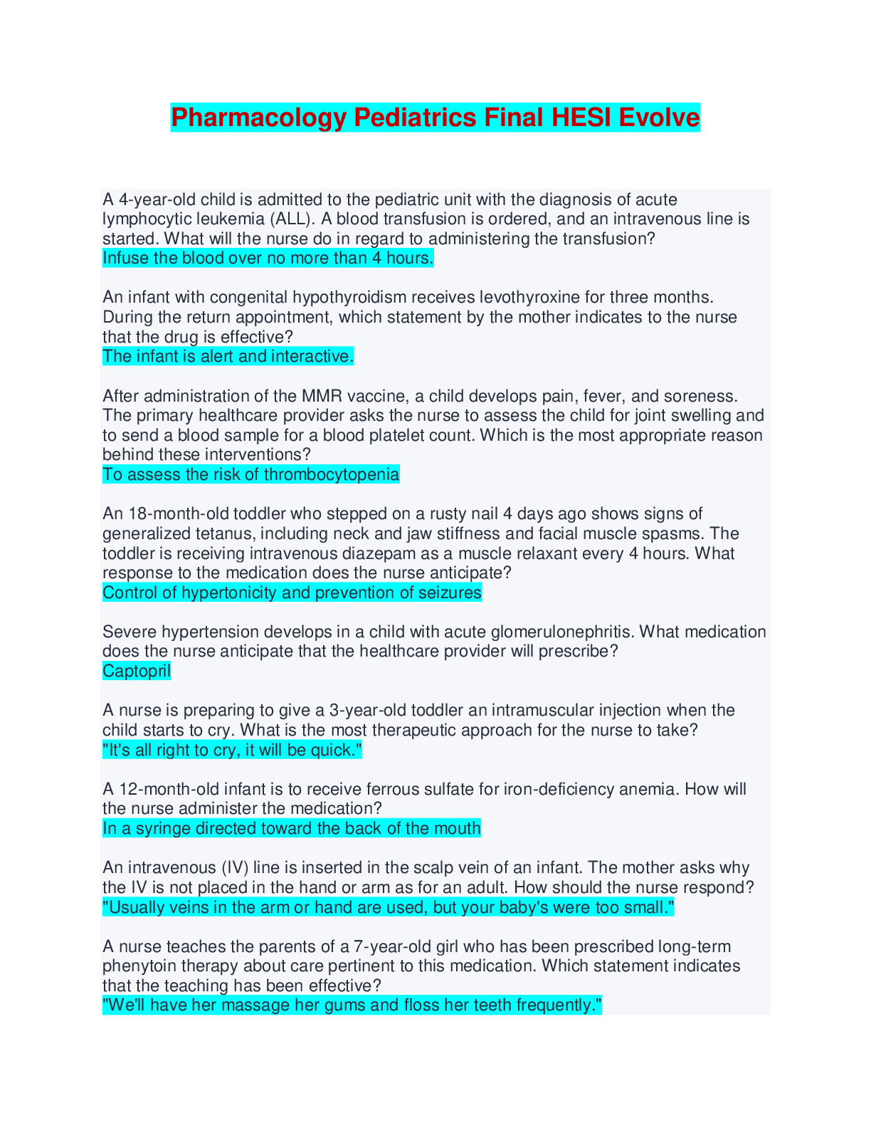 Medicine > EXAM > Pharmacology Pediatrics Final HESI (Evolve) - Questions and Answers (All)