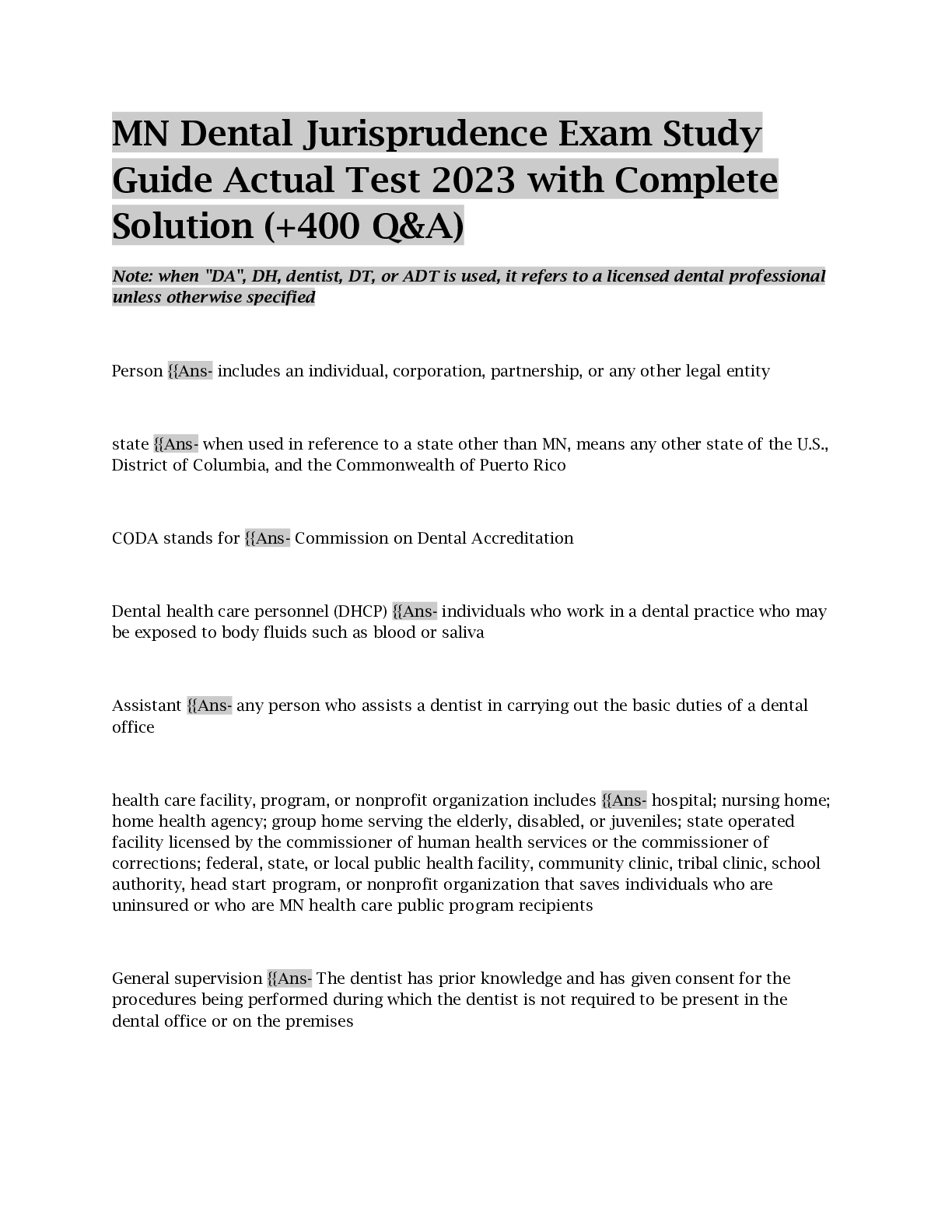 Medicine > EXAM > MN Dental Jurisprudence Exam Study Guide Actual Test 2023 with Complete Solution (+400 Q&A) (All)