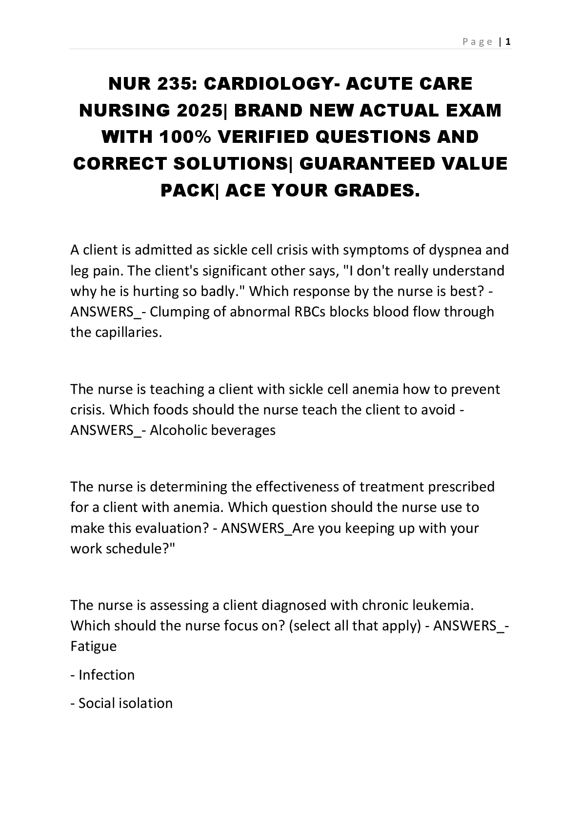 Cardiology > TEST BANKS > NUR 235: CARDIOLOGY- ACUTE CARE NURSING 2025| BRAND NEW ACTUAL EXAM WITH 100% VERIFIED QUESTIONS AND CORRECT SOLUTIONS A+ (All)