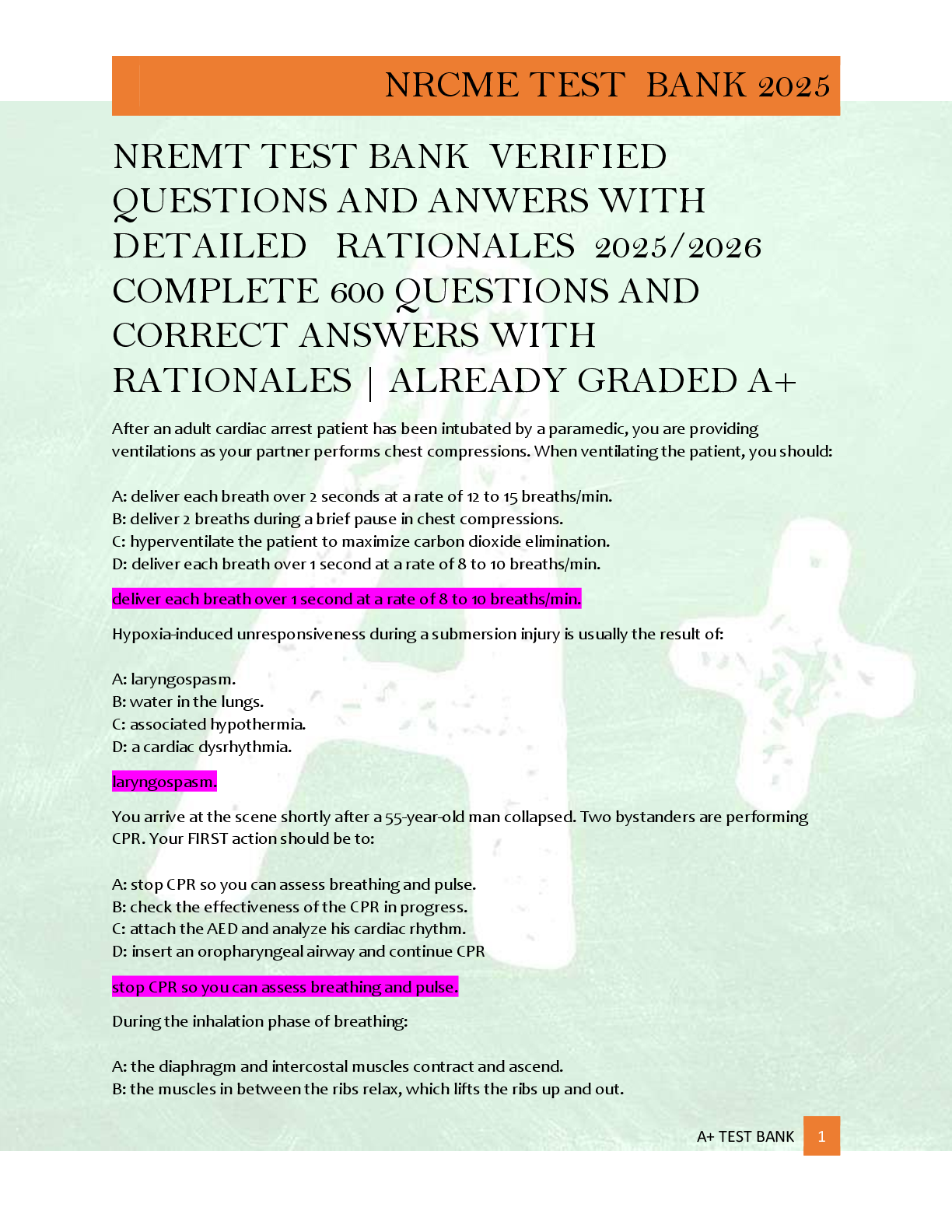 Cardiology > TEST BANKS > NREMT TEST BANK VERIFIED QUESTIONS AND ANWERS WITH DETAILED RATIONALES 2025/2026 COMPLETE 600 QUESTIONS AND CORRECT ANSWERS WITH RATIONALES | ALREADY GRADED A+ (All)