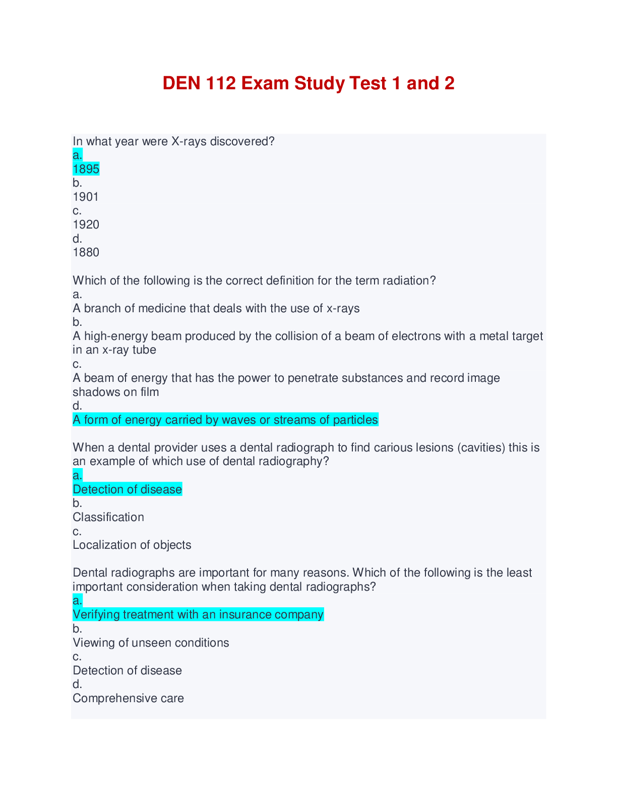 Dentistry > EXAM > DEN 112 Exam Study Test 1 and 2 - Questions & Answers (All)