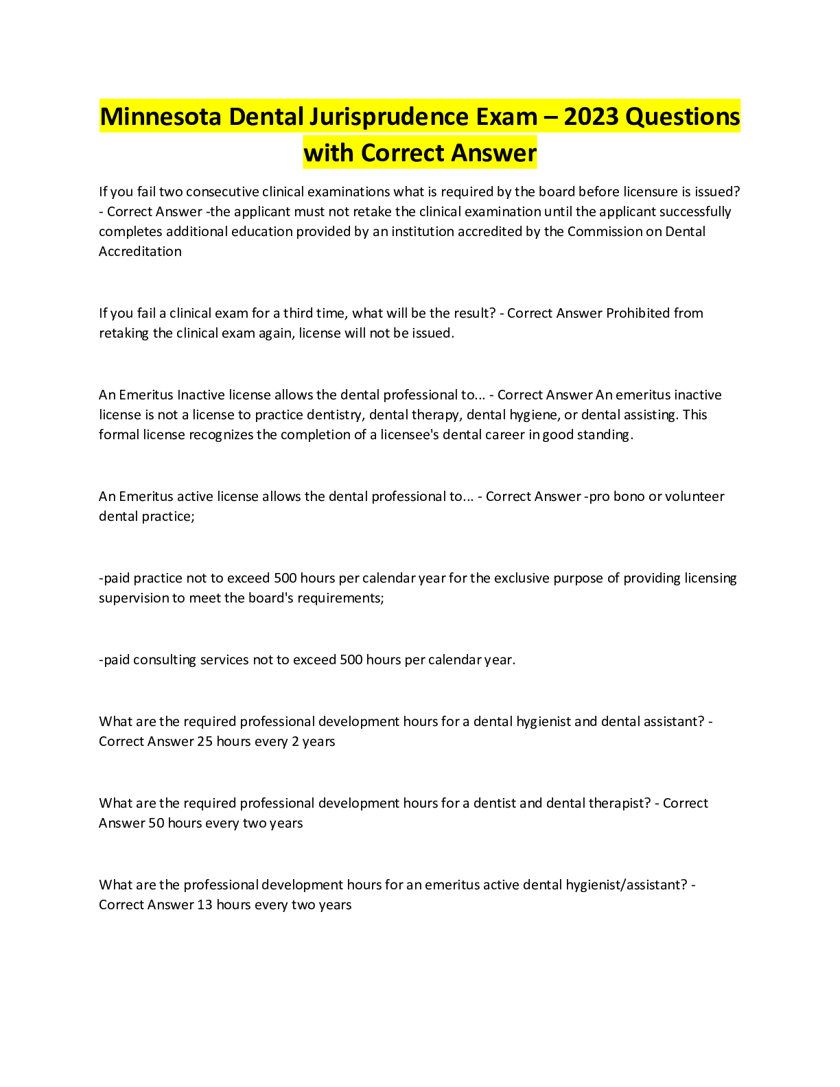 Dentistry > EXAM > Minnesota Dental Jurisprudence Exam – 2023 Questions with Correct Answer (All)