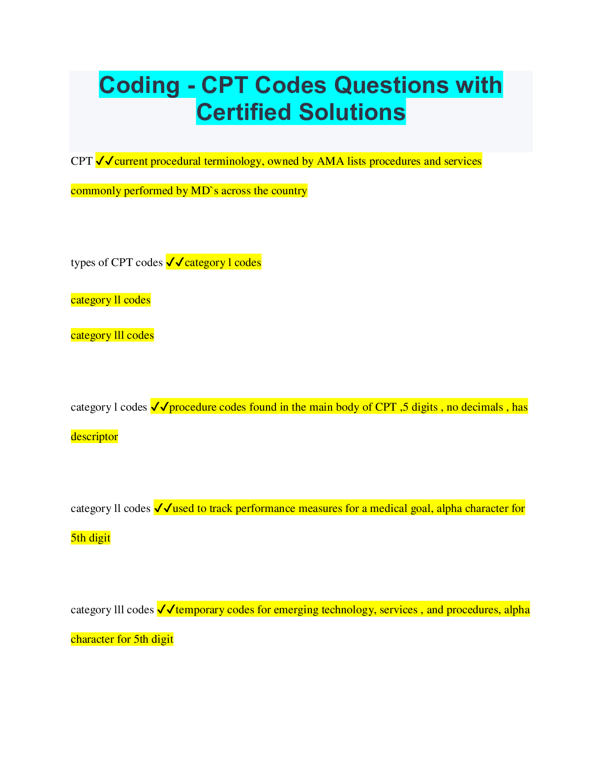 Health Computing > QUESTIONS & ANSWERS > Coding - CPT Codes Questions with Certified Solutions (All)