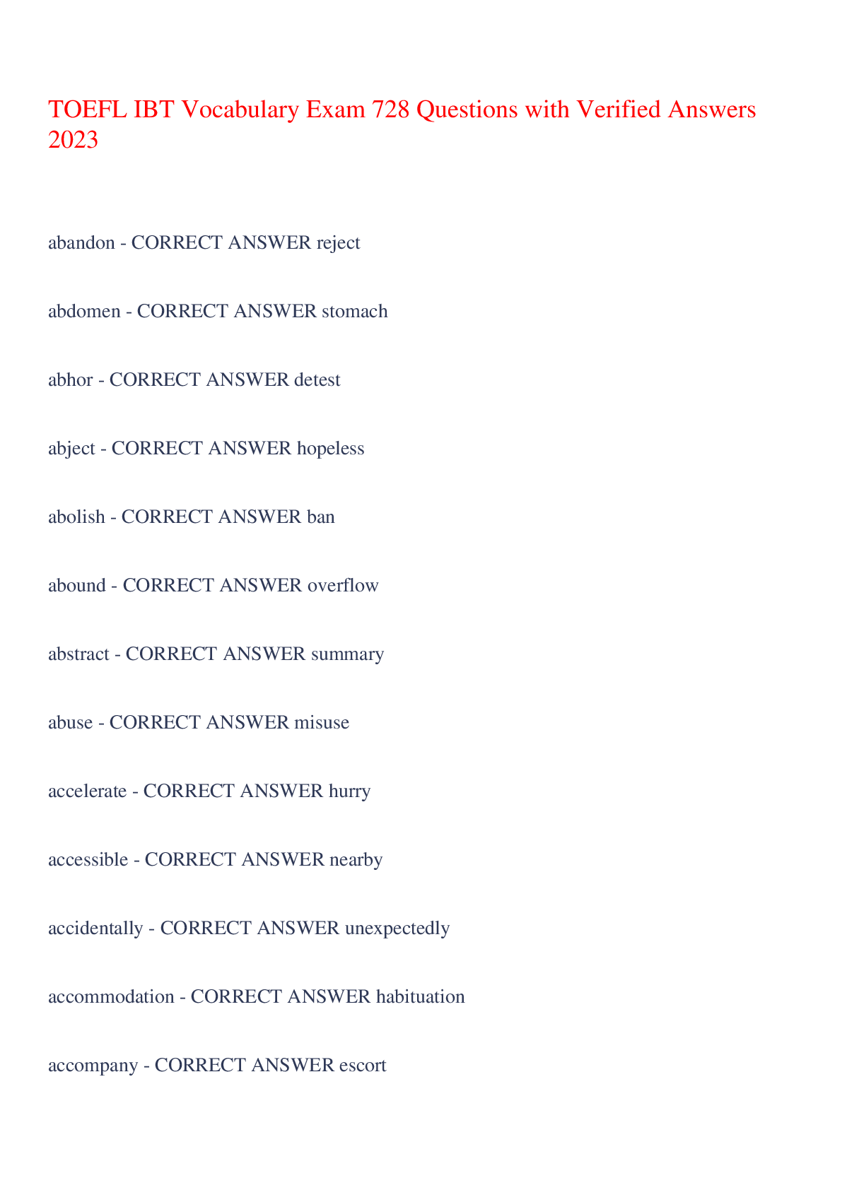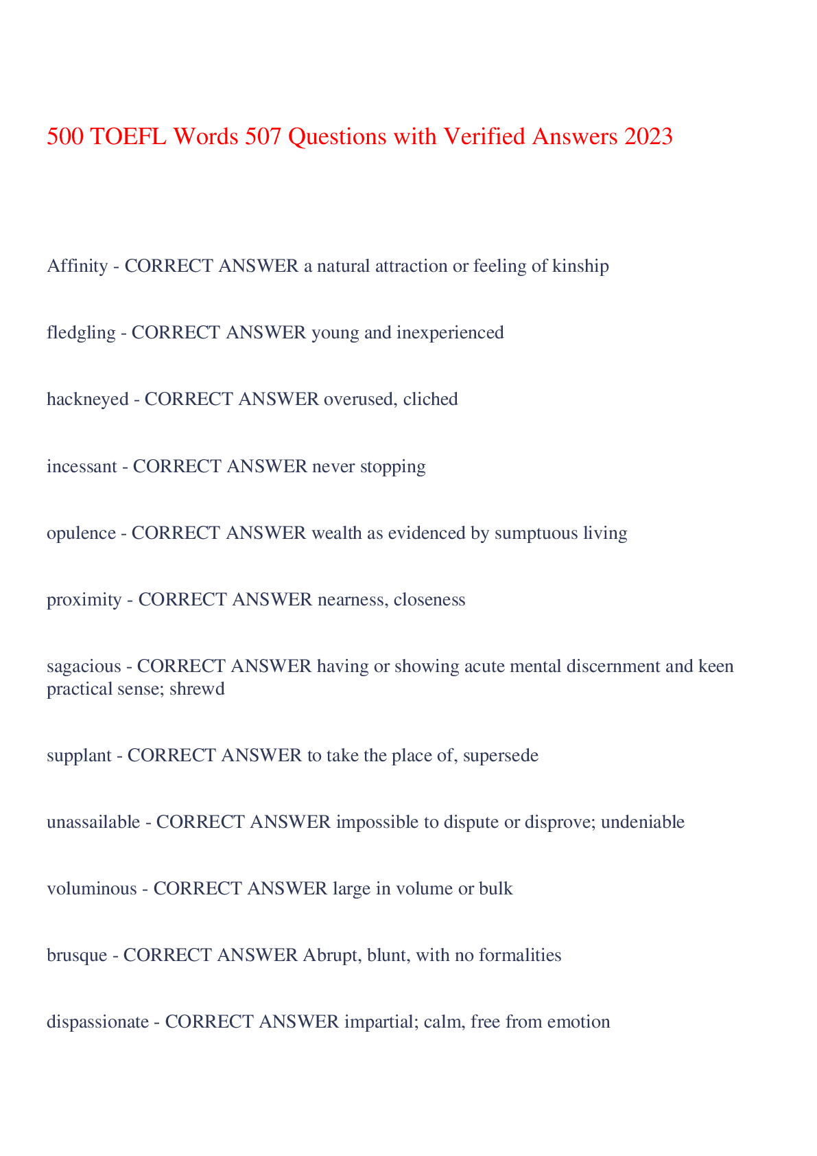 English > EXAM > 500 TOEFL Words 507 Questions with Verified Answers 2023,100% CORRECT (All)
