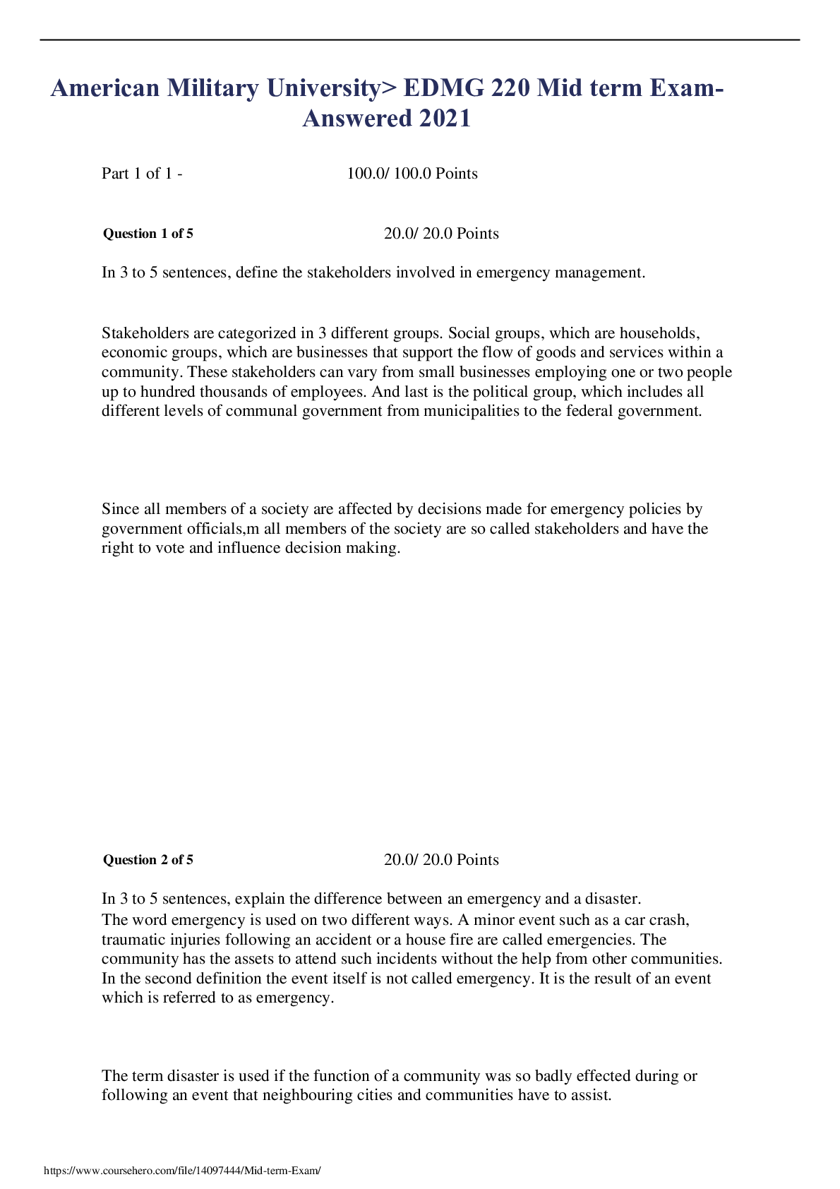 English > EXAM > American Military University> EDMG 220 Mid term Exam- Answered 2021 (All)