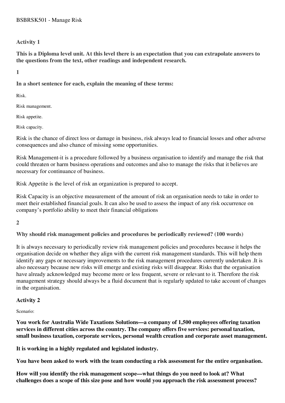English > QUESTIONS & ANSWERS > [Solved] BSBRSK501 Manage Risk Formative Assessment (All)