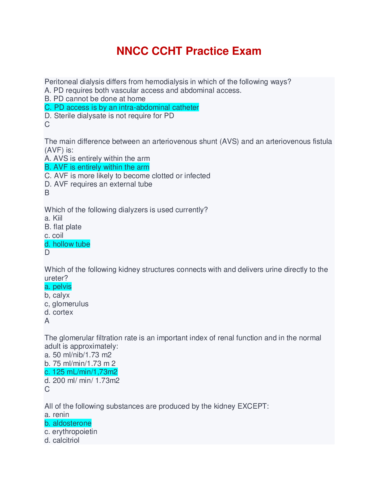 Nephrology > EXAM > NNCC CCHT Practice Exam - Questions and Answers (All)